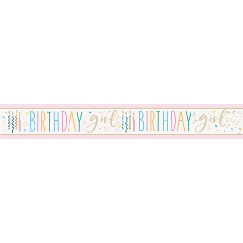This 9ft foil banner helps make the birthday girl feel especially celebrated. It features a glamorous design in pink, white, pastels, and gold tones. This decoration is easily displayed across walls, used as a party backdrop, or hung over an entrance.