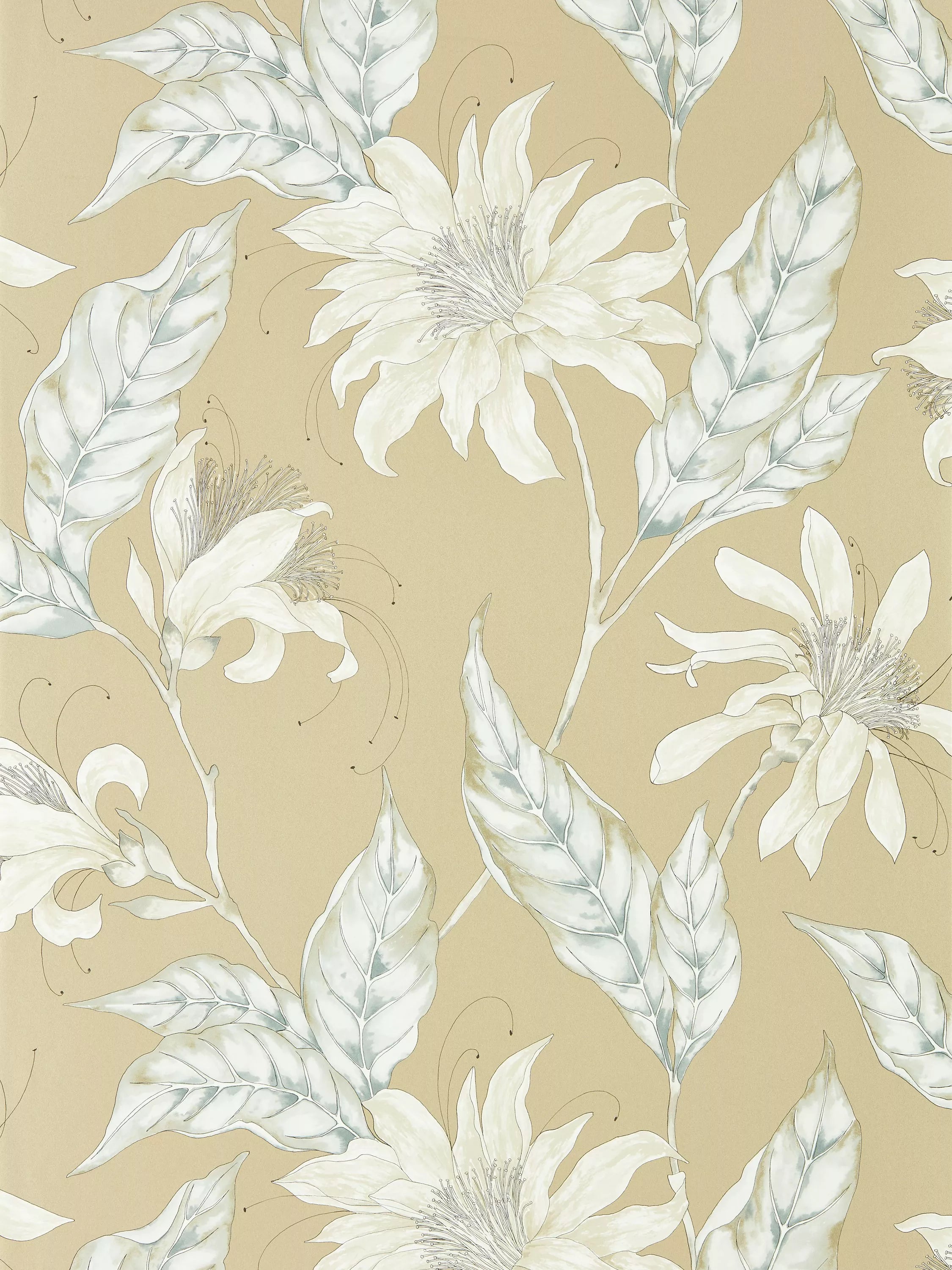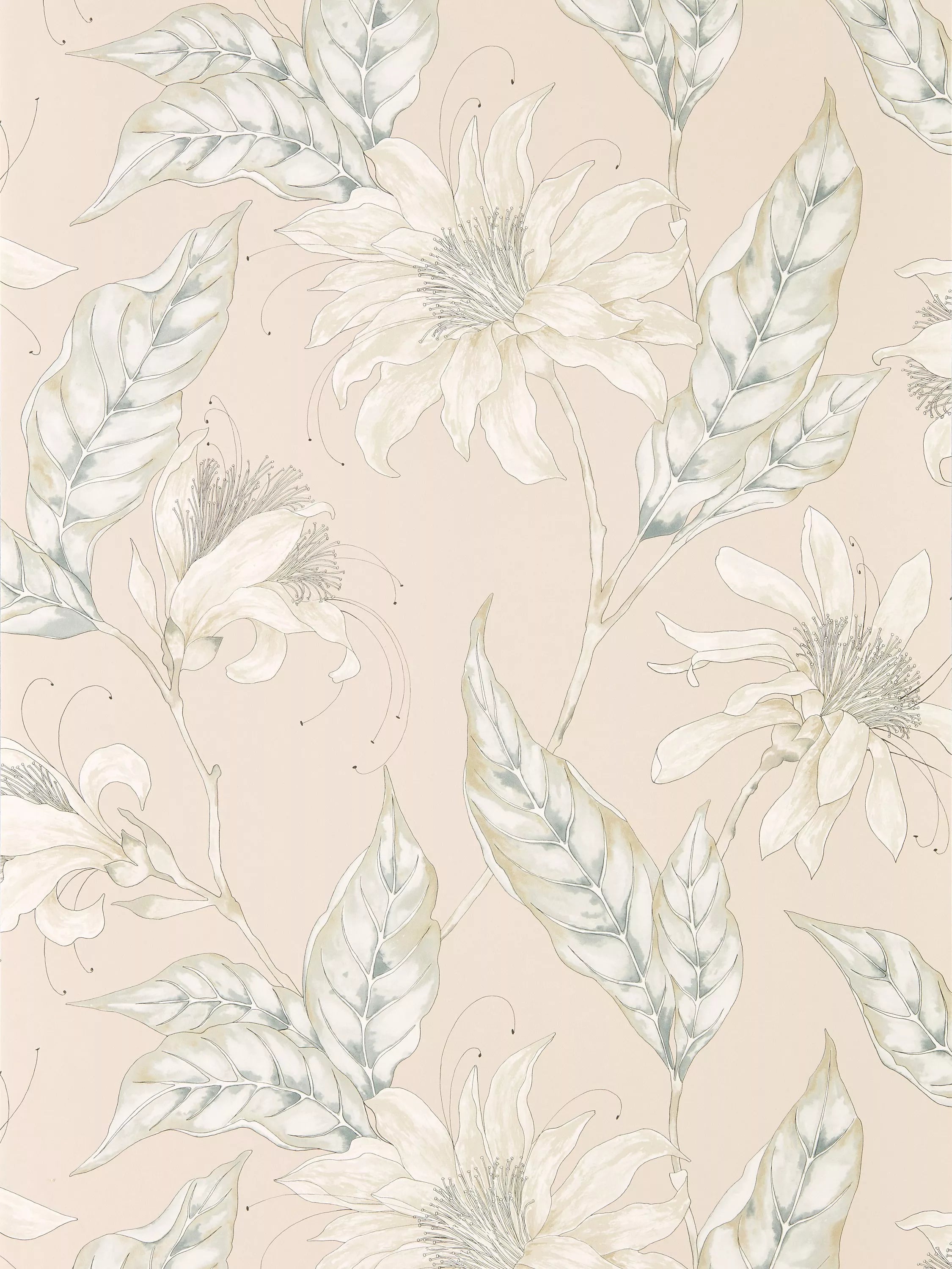 Hand drawn in pen and watercolour, this beautiful contemporary wallpaper is adorned with stylised tropical flowers. With its delicate painterly look and soft colour palette, intricate linework adds detail to this elegant design.