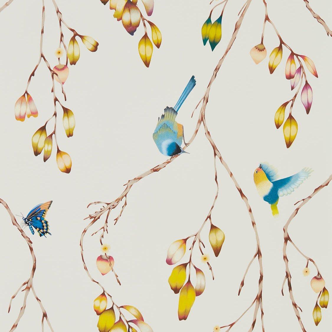 Harlequin Iyanu Wallpaper presents an elegant avian scene, featuring butterflies and birds settled upon sweeping willow-like branches. This detailed design brings natural beauty indoors, creating a truly calming environment within any space now. This premium wall covering is proudly manufactured in the UK, offering a distinctly decorative finish for sophisticated interiors.