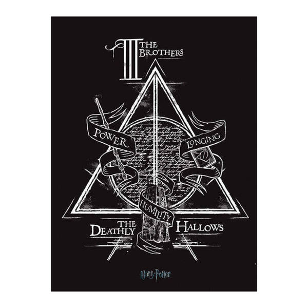 Display your fandom with this officially licensed Harry Potter canvas print featuring the iconic Deathly Hallows logo and text design. This quality piece is ready to hang, constructed with durable canvas stretched over a wooden frame for lasting presentation.