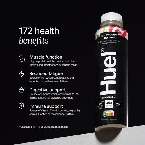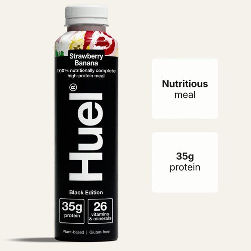 Huel Ready to Drink Black Edition offers fully balanced, nutritionally complete food in a convenient Strawberry Banana flavour bottle. This ready-to-drink format provides a substantial meal replacement designed to cover all daily needs efficiently.