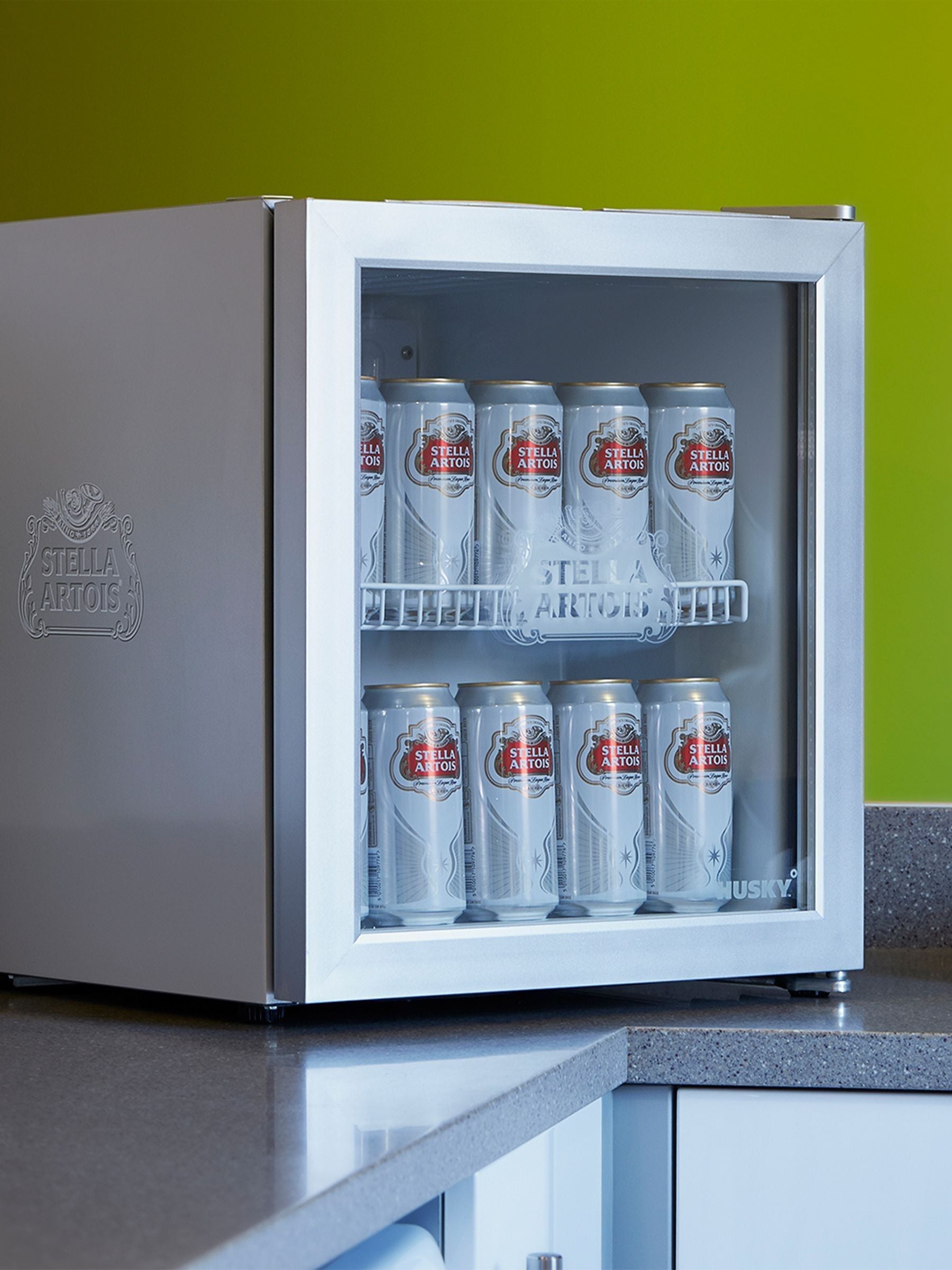 Enjoy ice-cold beer whenever you like from your very own iconic HUS-HM4 Silver Stella Artois Drinks Cooler. With the capacity to store and cool 40 regular sized cans, this Drinks Cooler is ideal for cooling your beers when you have friends over or when you’re chilling out enjoying a movie or the football with friends. This Drinks Cooler, with double glazed door, stores up to 40 x 440ml cans of beer, controlling the temperature via an adjustable 5 setting thermostat. Official Stella Artois branding. Compressor technology. Adjustable thermostat. Capable of storing 40 x 440ml cans. Reversible door. Size (HxWxDmm): 510 x 430 x 460.