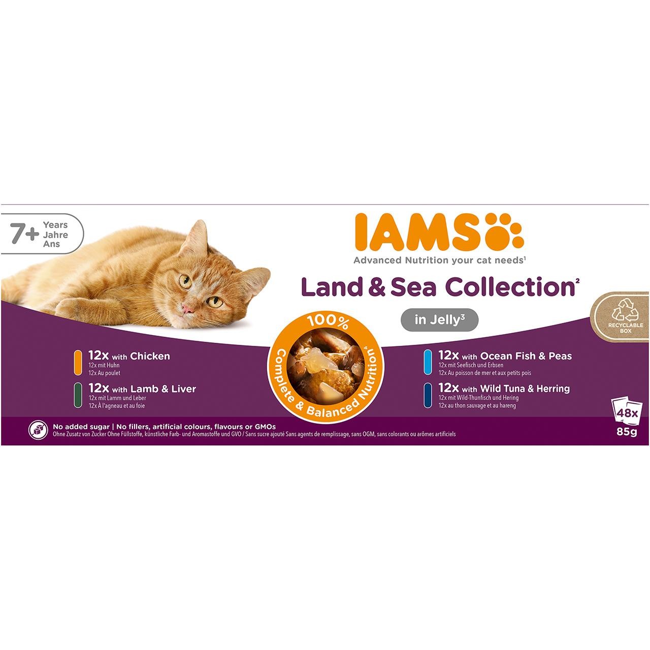 IAMS Advanced Nutrition Meat and Fish Variety Mix in Jelly is a complete and balanced wet food formulated for cats aged seven years and older. This selection provides four distinct, appealing flavours to maintain your senior cat's interest at meal times. The advanced nutrition recipes offer essential nutrients tailored to support mature felines throughout their lives.