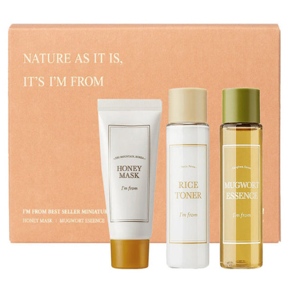the im from best seller miniature set consists of im from honey mask 30g x 1 im from mugwort essence 30ml x 1 im from rice toner 30ml x 1