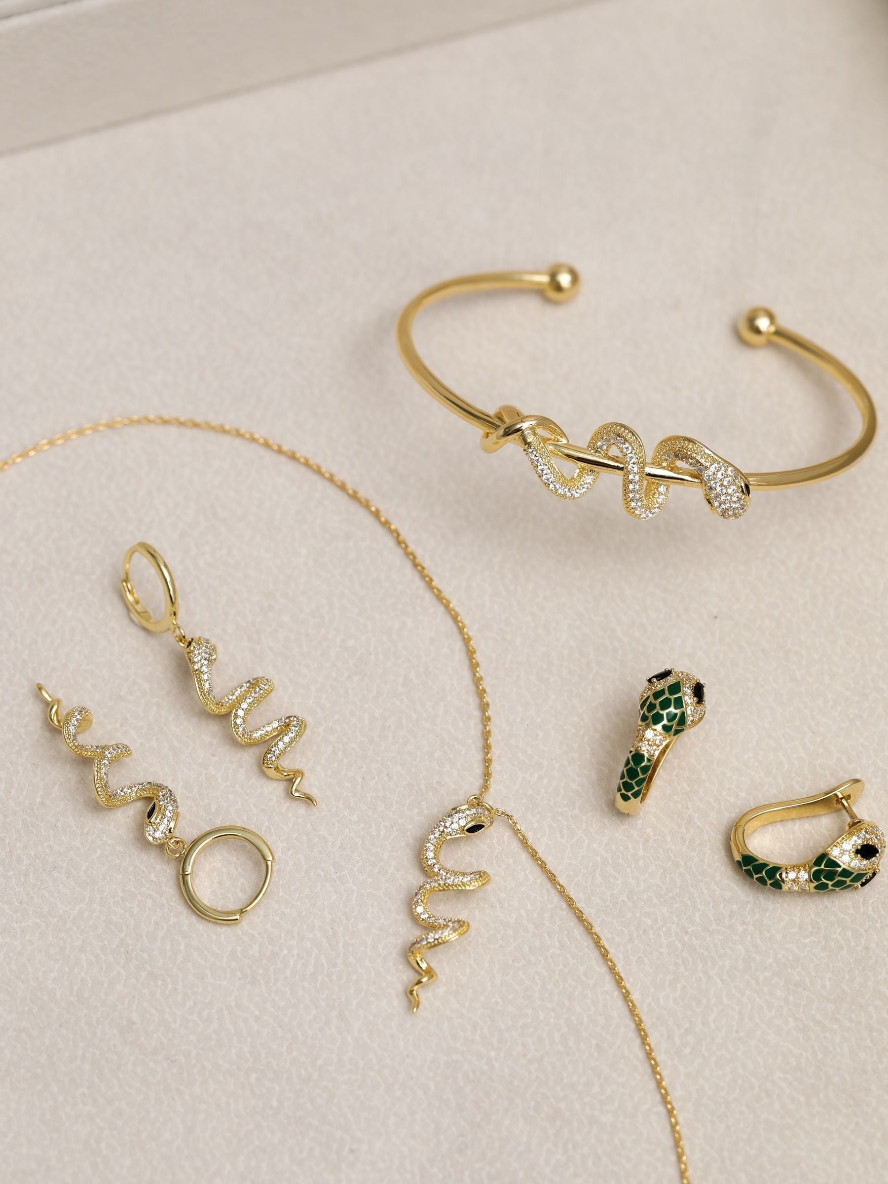 Our Inicio 14K Gold Plated and Emerald Snake Hoop Earrings are a must-have striking accessory that combines a bold design with a luxurious finish. Fastening: Hoop. Width dimension: 14mm. Length dimension: 15mm. Material: 14K Gold Plated Base Metal.