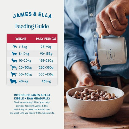 Introduce James & Ella kibble + raw gradually. Start by replacing 25% of your dog's previous food with James & Ella and slowly increase the amount over one week until you reach 100% James & Ella. Always make sure there is fresh drinking water available.