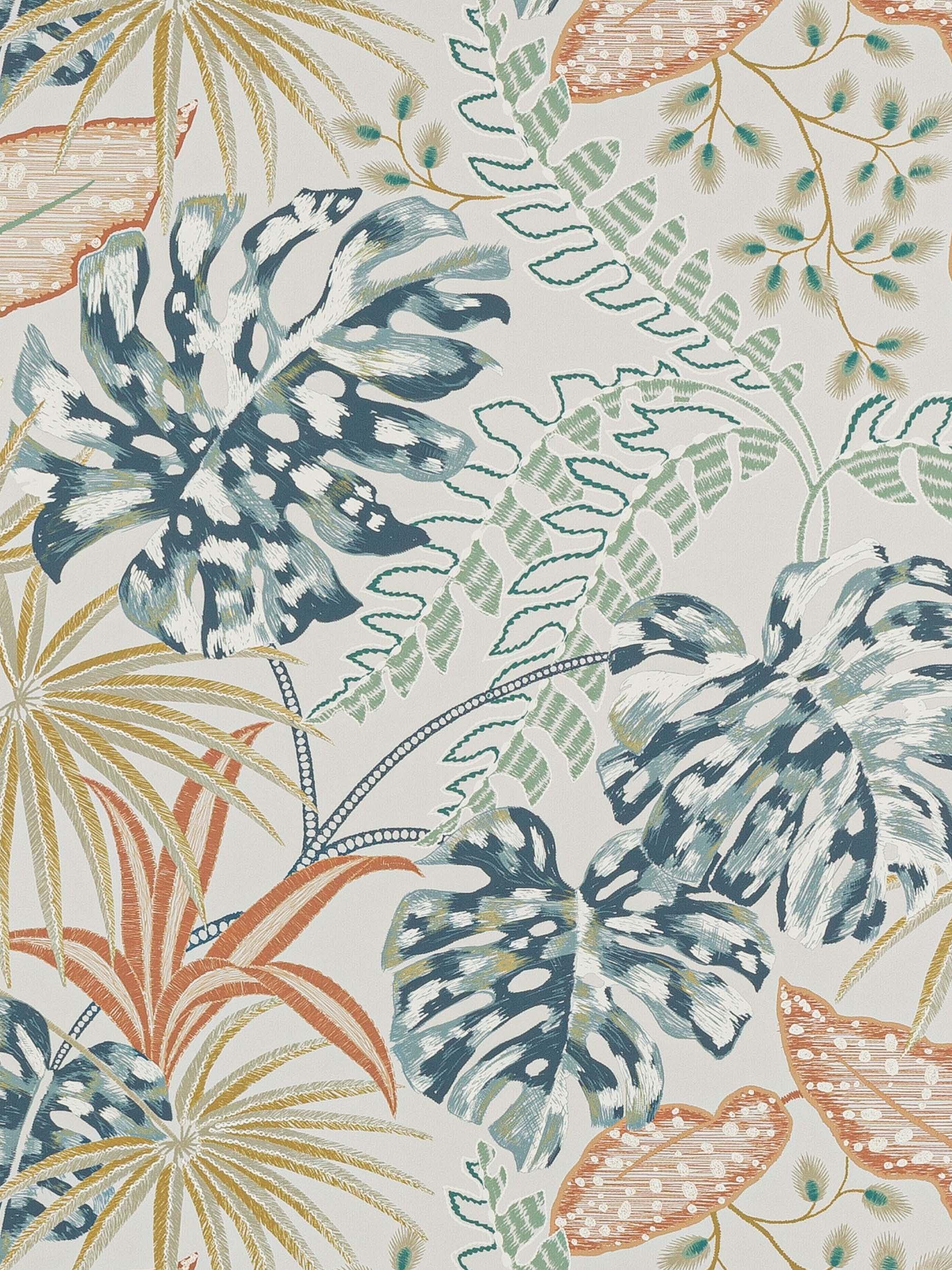 This wallpaper is digitally printed to highlight the textural elements of the original stitchwork of the matching fabric design fabric. Like embroidery on the wall, its layered large scale tropical leaves and finer, more delicate fronds are bold and uncompromising.