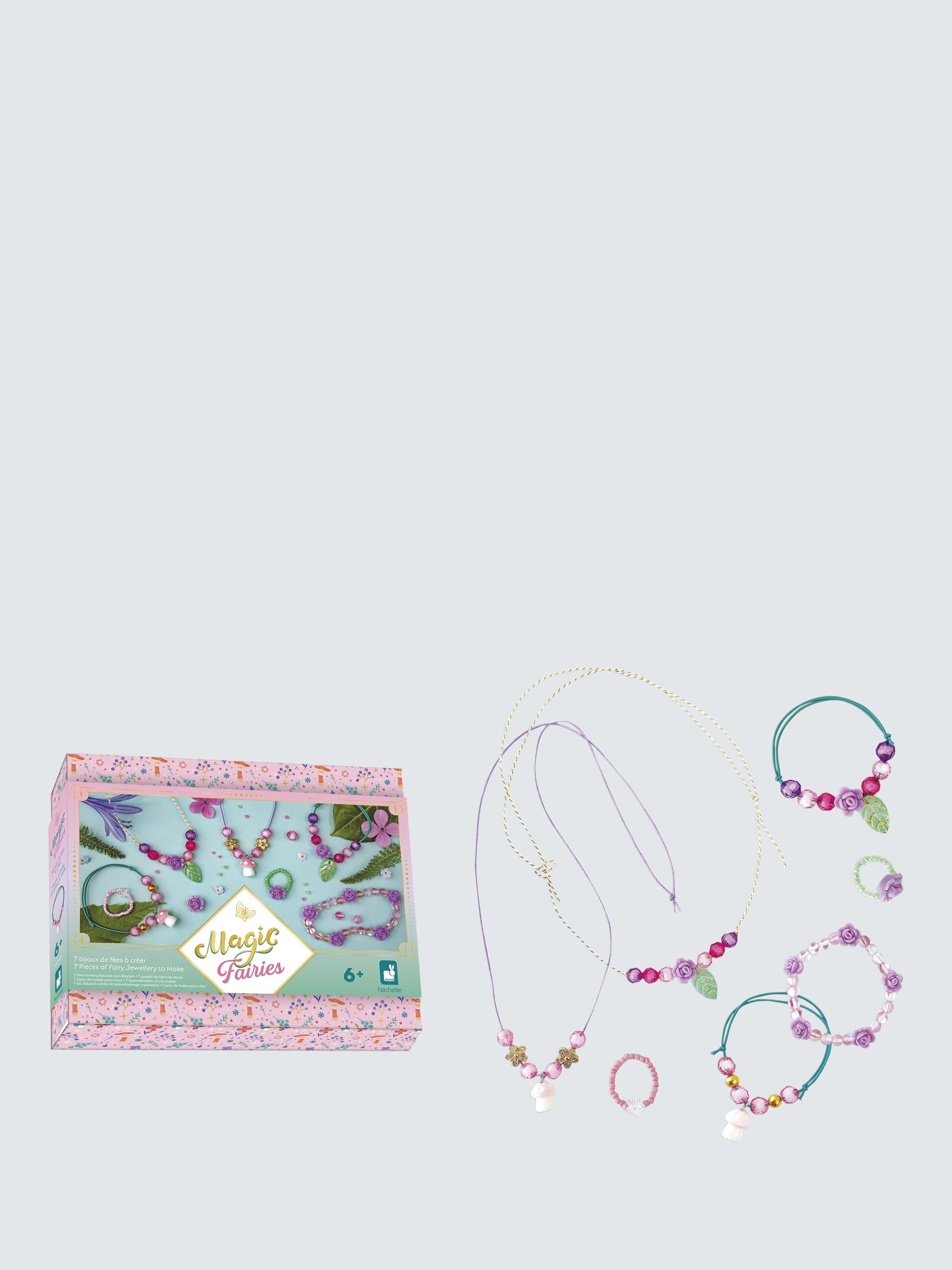 Read MoreBecome a real fairy with this magical jewellery set! Use this craft kit to make 2 necklaces, 3 bracelets and 2 rings out of translucent beads, flowers, leaf charms and mushroom charms. The box transforms into a pretty jewellery box, when you use the crosspieces provided to create 4 compartments. It contains 2 mushroom charms, 8 rose-shaped beads, 1 transparent flower bead, 1 golden flower bead, 2 leaf pendants, 50 seed beads, 2 golden beads, 20 transparent pink beads, 20 round beads, green elastic thread, transparent elastic thread, purple thread, braided thread and 1 booklet, complete with instructions and models. This activity helps develop patience and dexterity. It is ideal for children aged 6 and over.