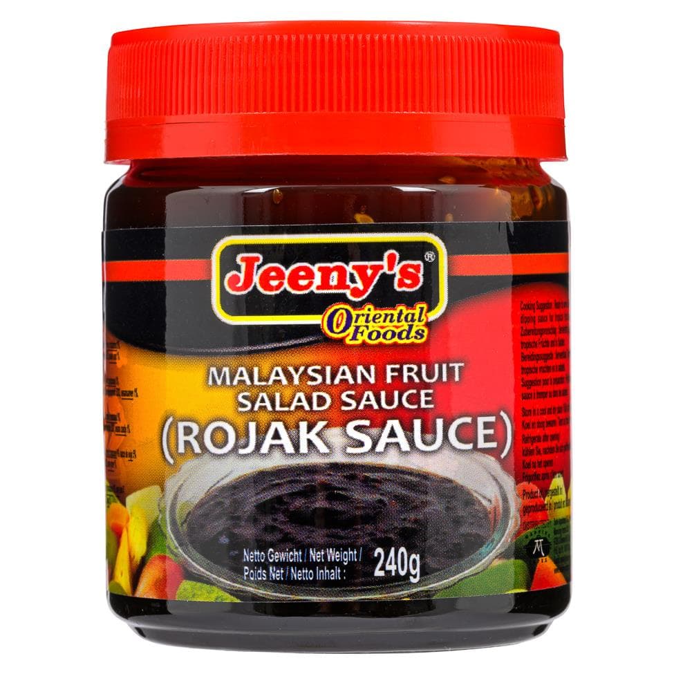 Jeeny's Malaysian Fruit Salad Sauce, also known as Rojak Sauce, is a flavorful and tangy condiment traditionally used in Malaysian cuisine to dress fruit salads. This thick, dark sauce is made from a combination of shrimp paste, sugar, chilli, and tamarind, creating a unique blend of sweet, salty, and spicy flavours. It's commonly paired with a variety of fresh fruits and vegetables, such as pineapples, cucumbers, and jicama, in the famous Malaysian dish known as \rojak.\ Jeeny's Rojak Sauce is perfect for those who enjoy bold, complex flavours and want to bring an authentic taste of Malaysia to their fruit salads or snacks.