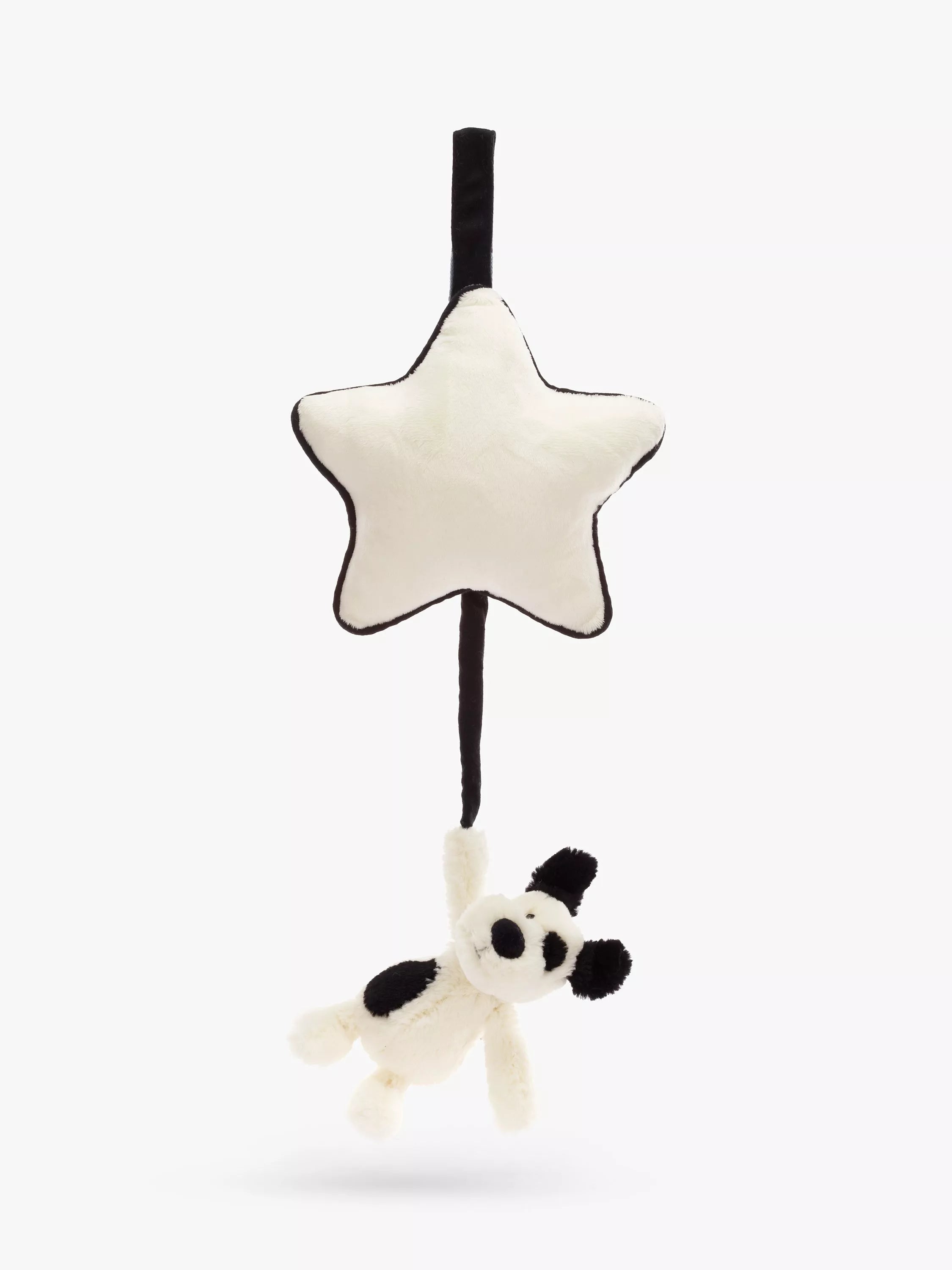Bashful Puppy Musical Pull from Jellycat is sure to send little ones to a joyful dreamland. This tiny Bashful Puppy suspends from a soft cream star with contrast piping, all created from recycled fibres. Pull down to play the sweet original Jellycat Lullaby.