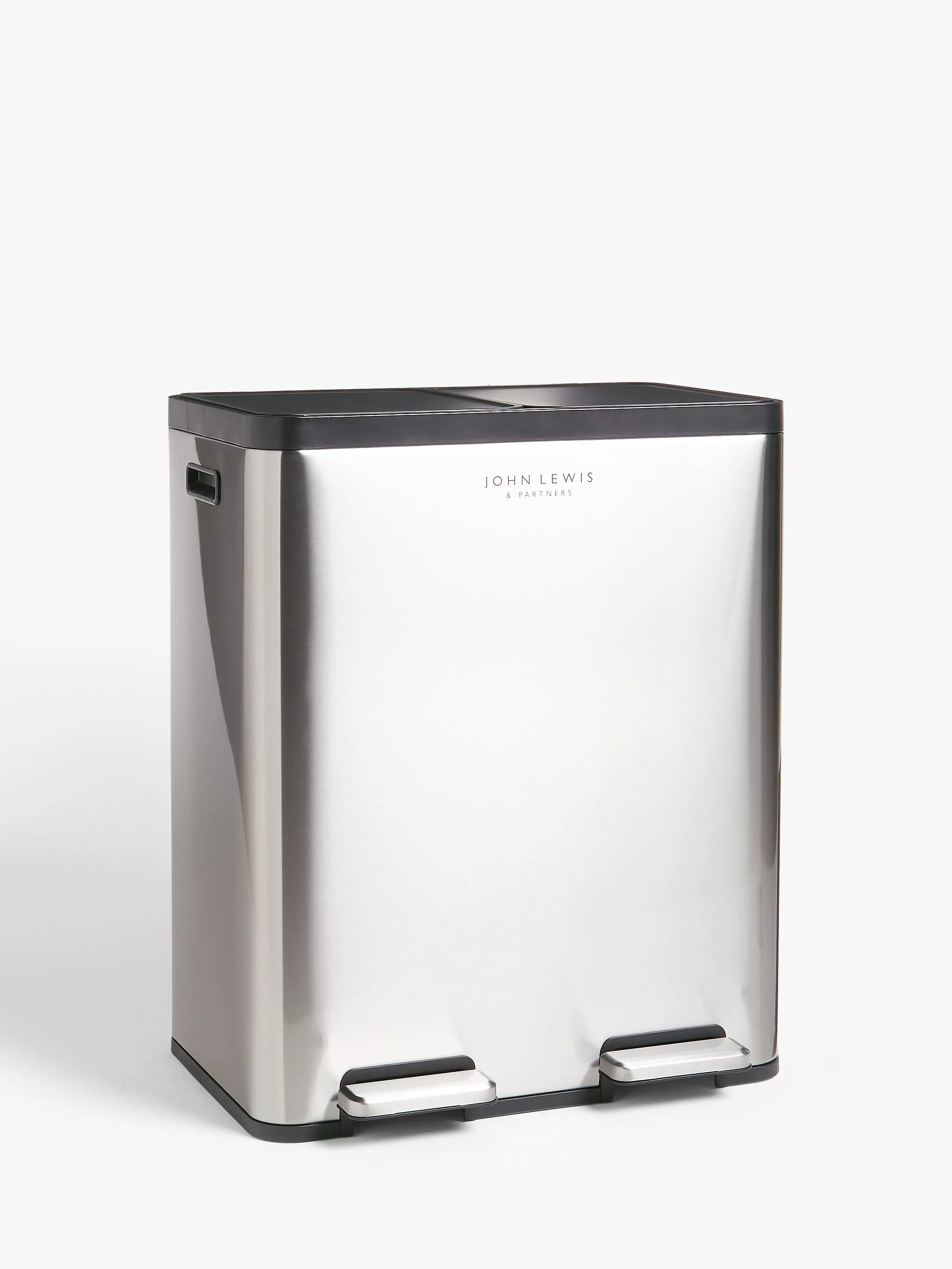 This space-efficient 2-section recycling bin fits perfectly against a wall.