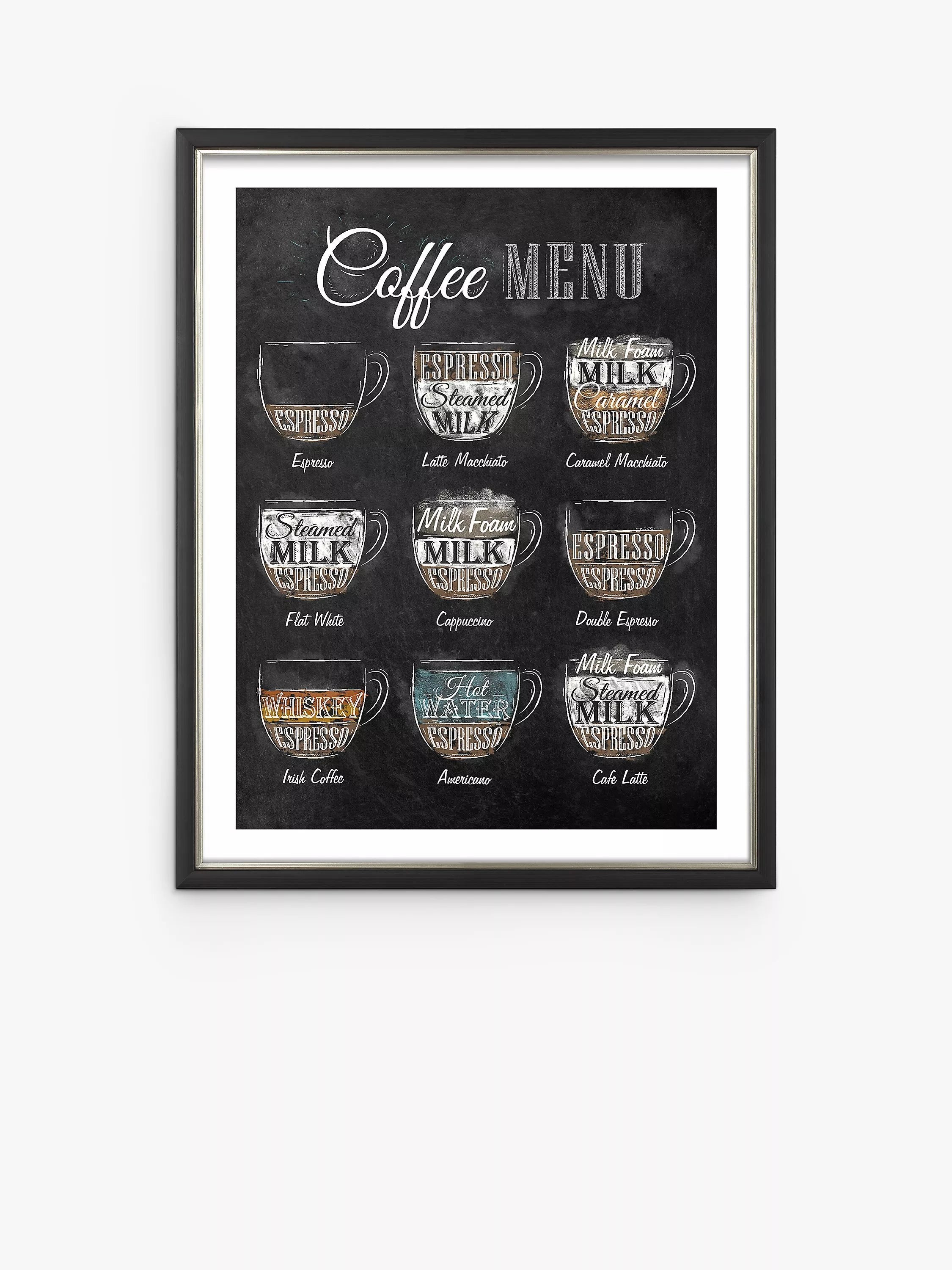 A vintage-style coffee menu poster by artist Anna Kozlenko, presented in a black frame with a silver lip.