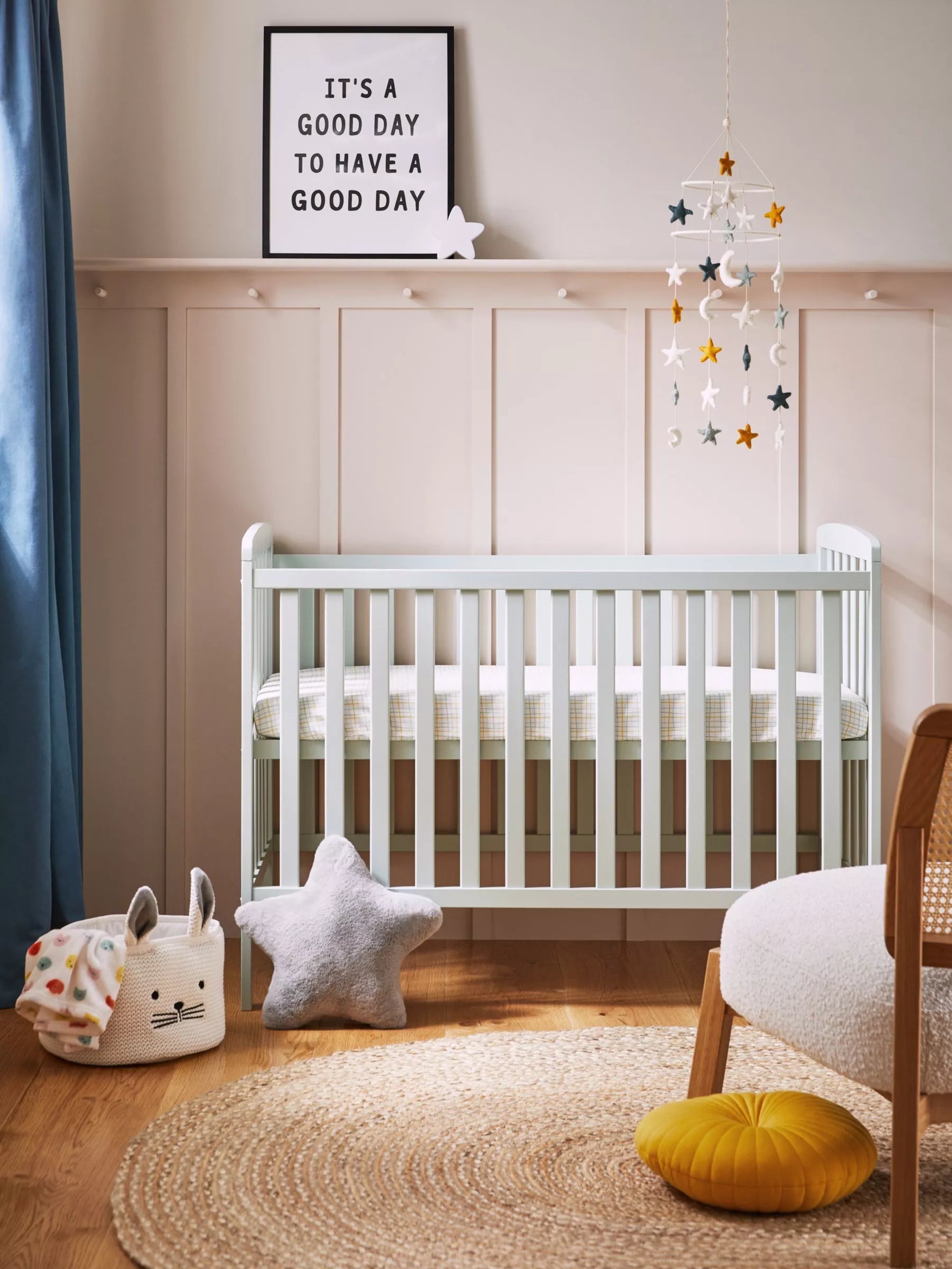 Suitable from birth, this cot requires a standard 120 x 60cm mattress with a maximum thickness of 12cm (sold separately). The cot complies with safety standard EN 716-1:2017+AC:2019.