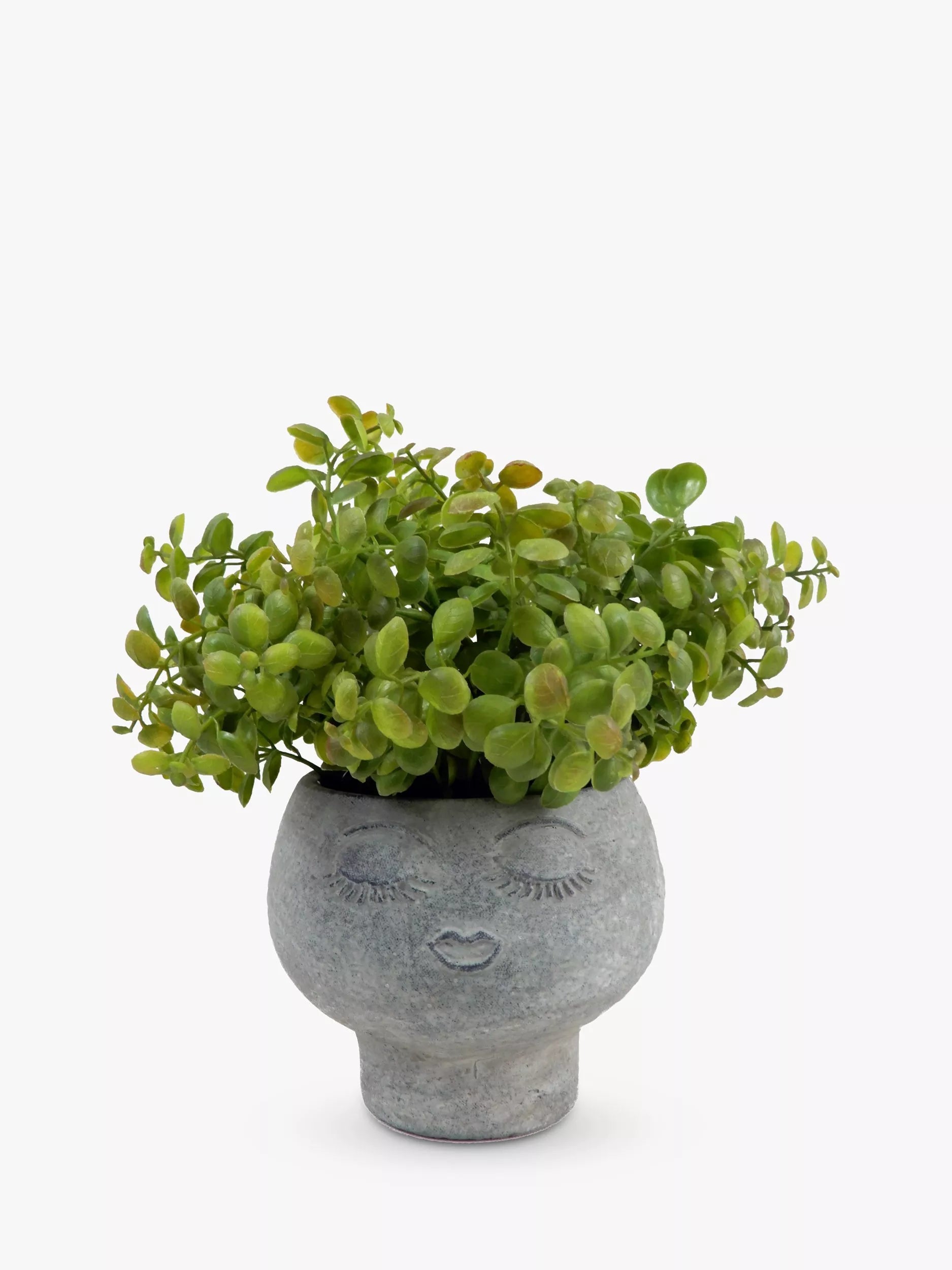 A quirky addition to your home, this stone planter has an etched face making the artificial eucalyptus on top a truly unique hairstyle as well as an attractive plant.