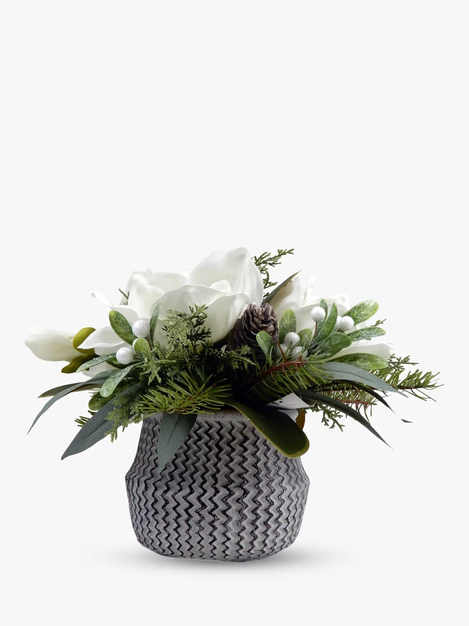Add a touch of elegant, year-round charm to your home with this artificial magnolia and pinecone arrangement. This beautiful centrepiece requires no maintenance and adds a sophisticated touch to any room, perfect for those with less natural light. Enjoy its beauty time and time again.