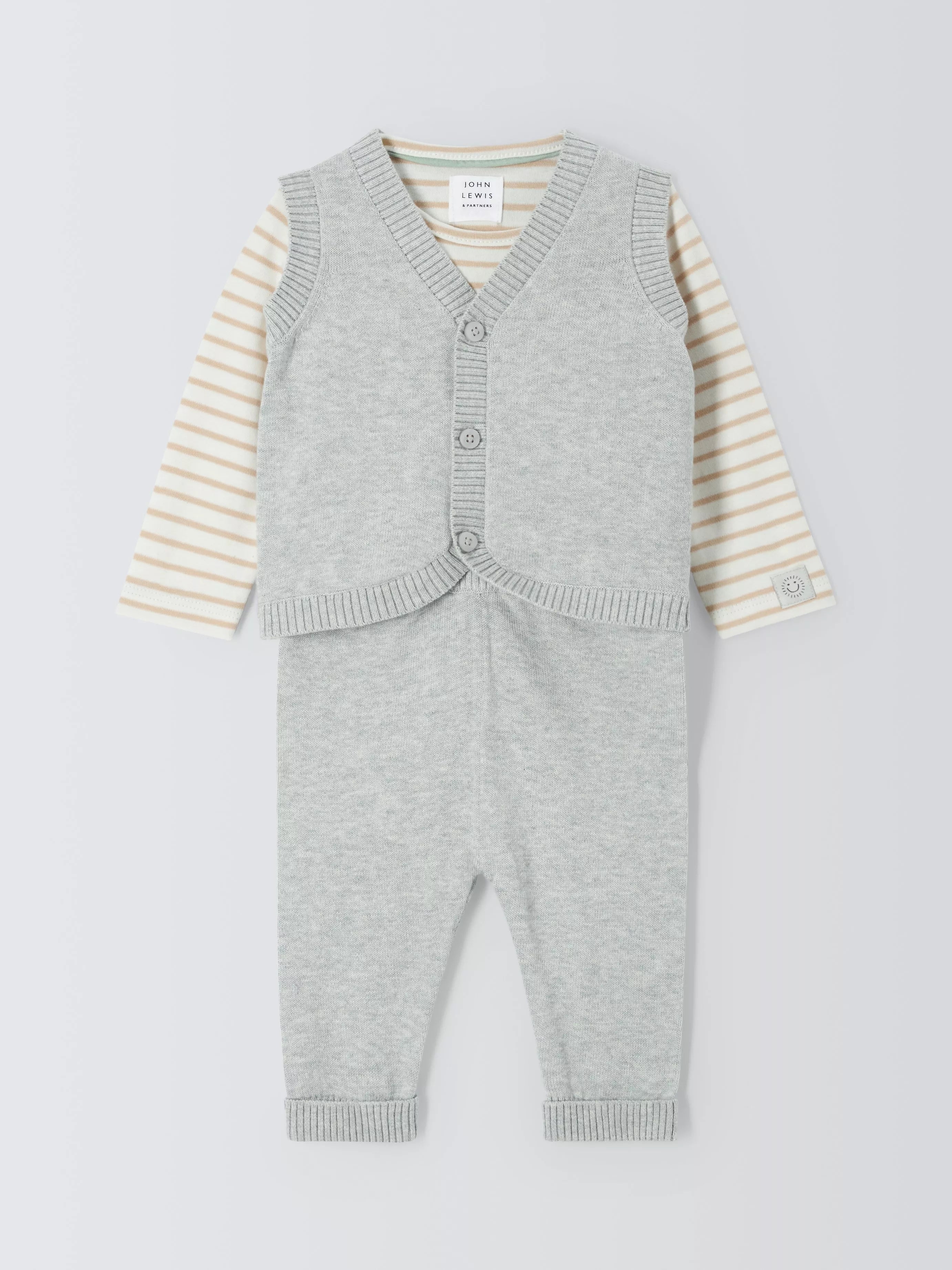 Made from 100% cotton, this traditionally styled baby's outfit comes with a long-sleeved bodysuit, knitted trousers and a matching knitted vest cardigan. A great choice for play dates, the set can be mixed and matched as desired.