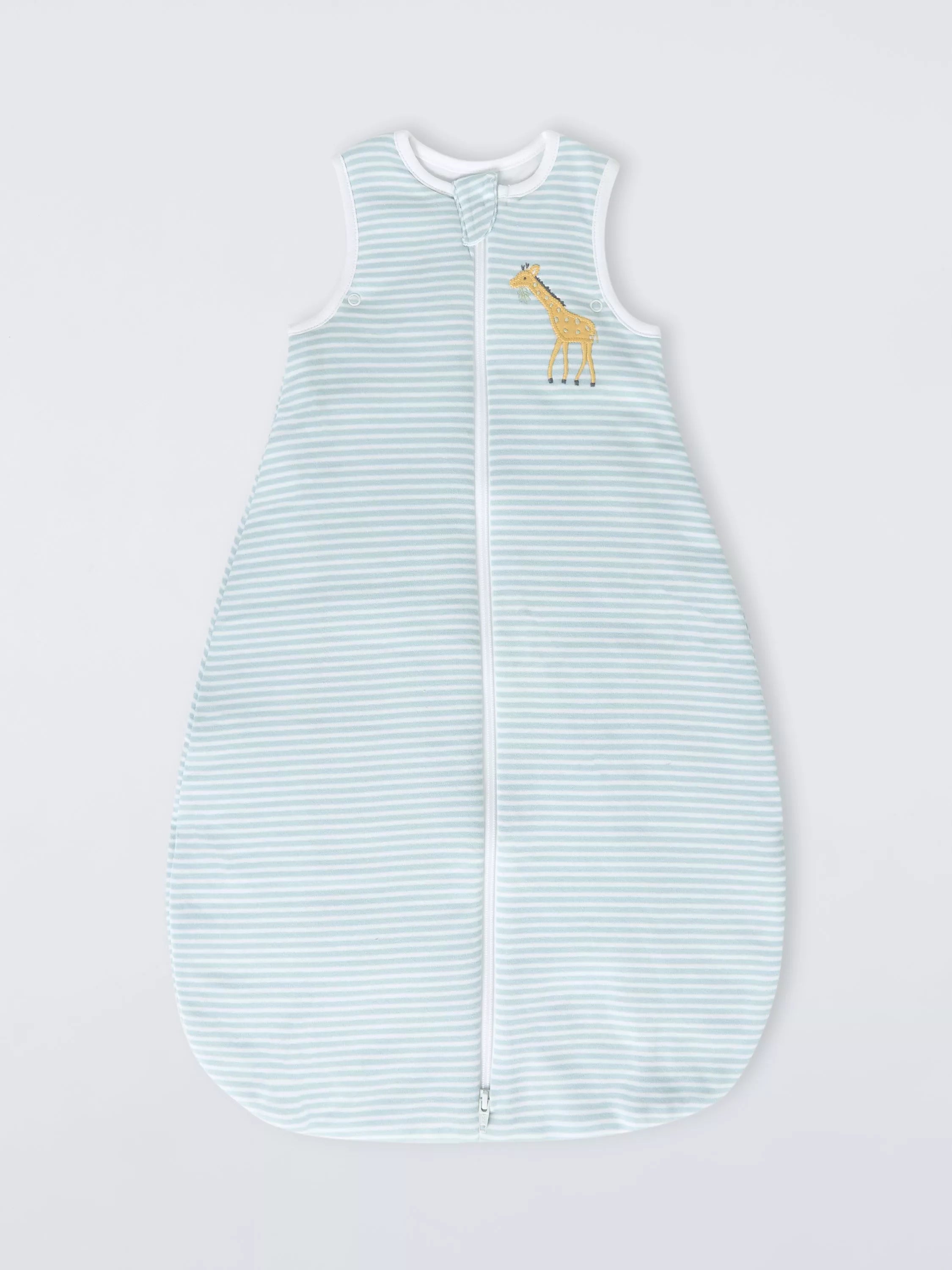 Made from pure, breathable, cotton, this cosy sleeping bag lets you cuddle your baby to sleep and put them to bed with no fuss. The bag has a zip-through middle (with zip guard)to make on and offs a breeze. It is completed with a classic stripe print with an embroidered giraffe friend on the chest.