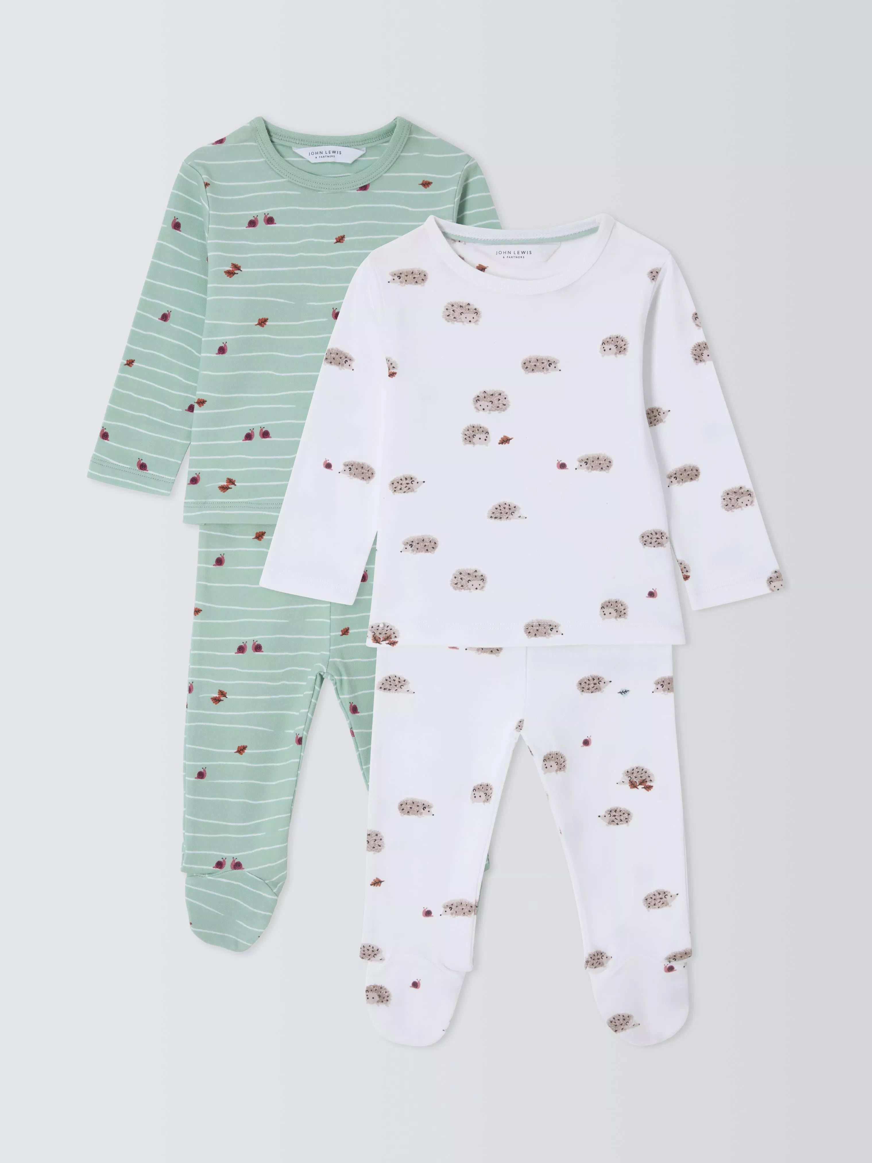 This pack of 2 pyjamas are made from super soft cotton that's breathable and comfy to wear. One style is covered in an all-over hedgehog print while the other is covered in snails and leaves.