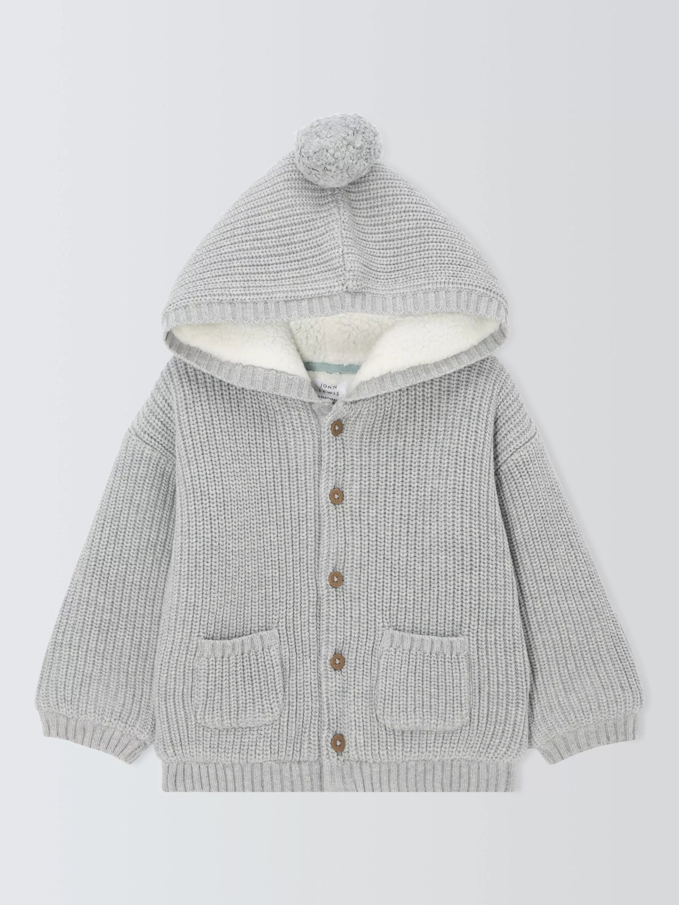 Kept simple for versatility, this knitted cardigan has a hooded design, complete with a pom on the top. Ribbed cuffs and hemline provide a great fit while the fleece lining ensures your little one stays warm.