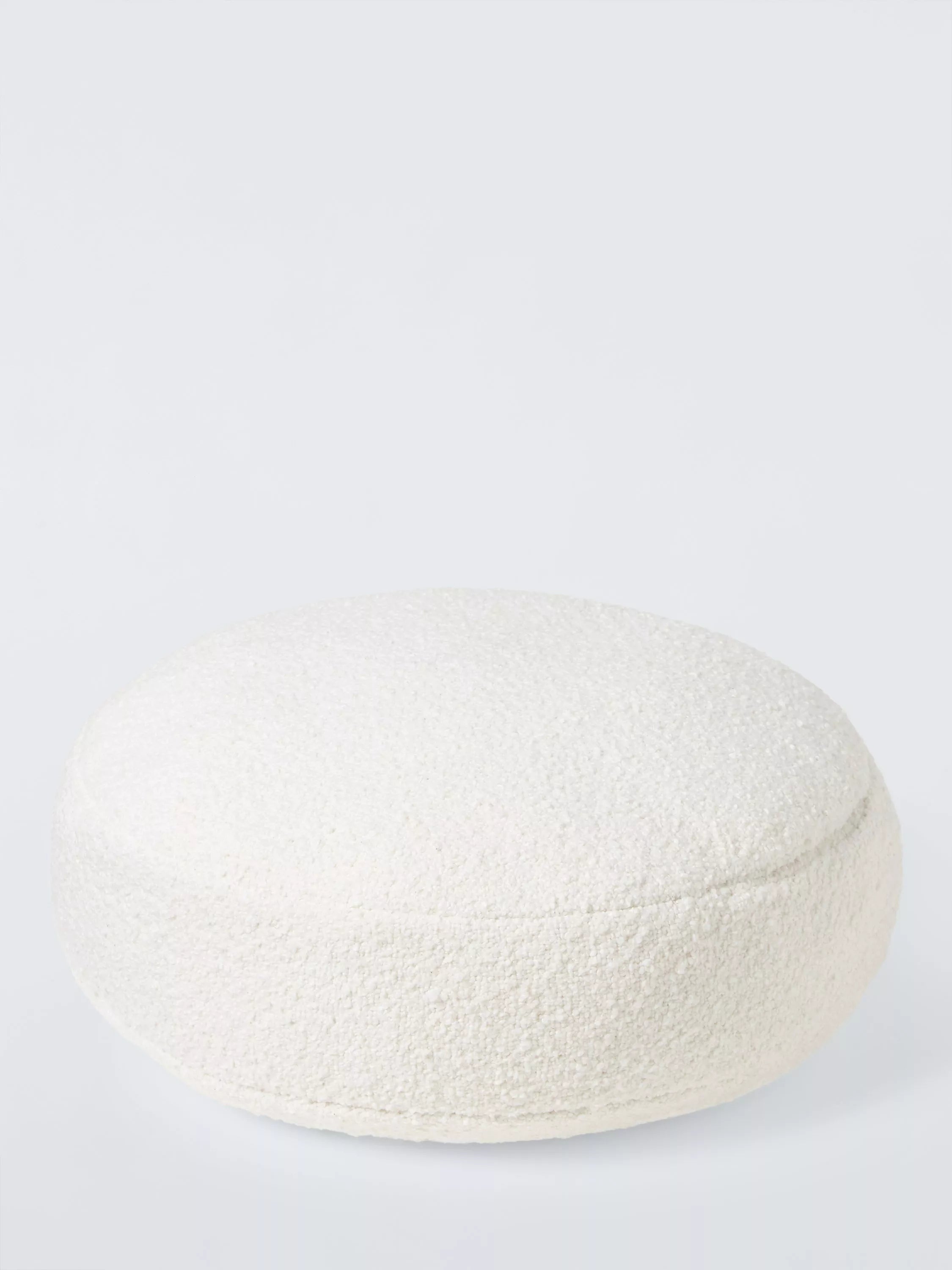 A comfy, round boucle fabric cushion in marshmallow white. Use to add texture and interest to a plain leather sofa or armchair.
