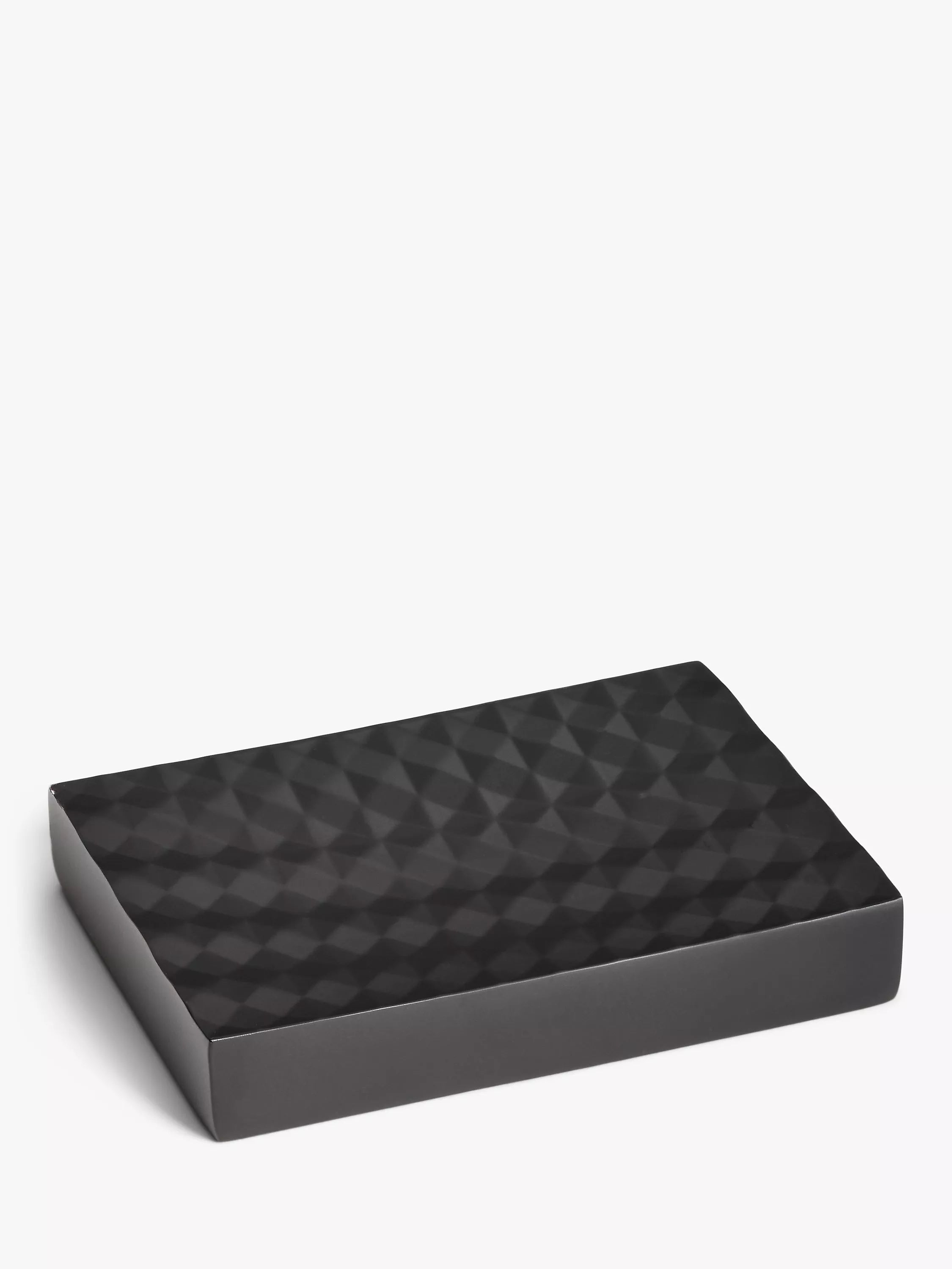 This polyresin soap dish has a textured diamond design that subtly reflects the light for a sleek and modern bathroom look.