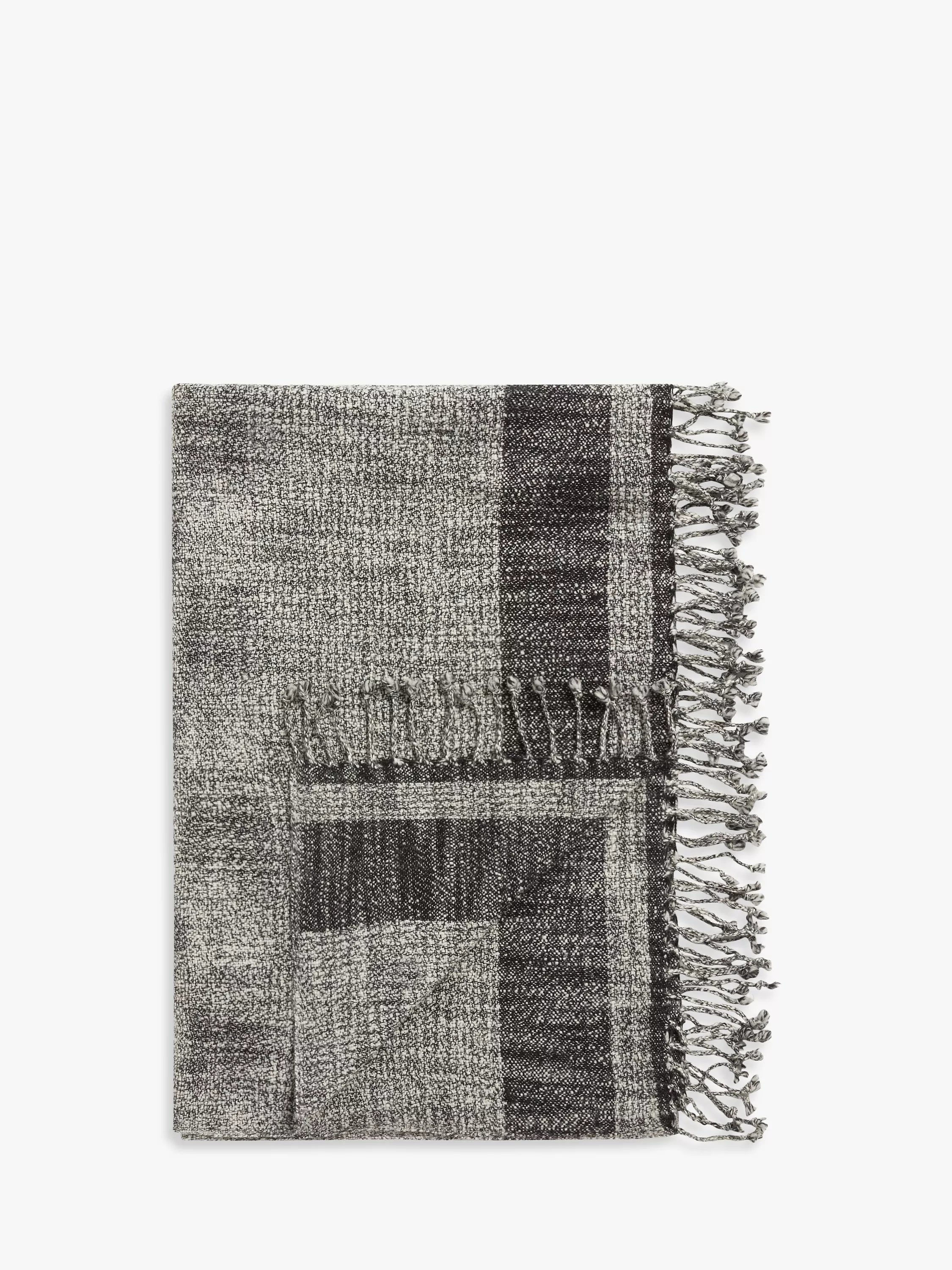 This lightweight slub wool throw has beautiful tonal gradations in shads of black and white and is finished with a fringed edge.
