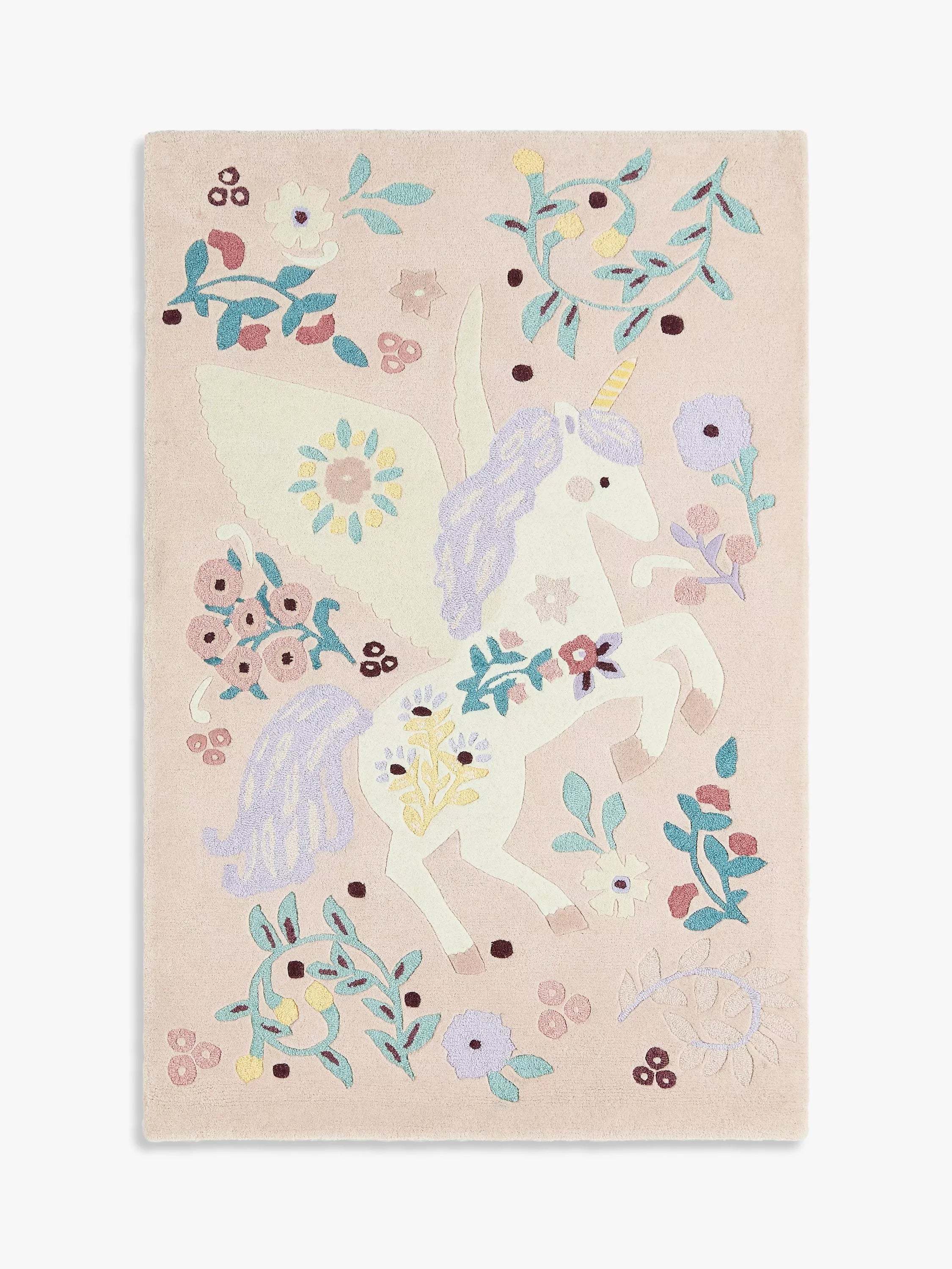 Bring a bit of magic to their space with this Enchanted Garden rug featuring a flying unicorn surrounded by beautiful blooms. Made from a high-quality, pure wool pile, it has a thick and comfortable feeling underfoot.