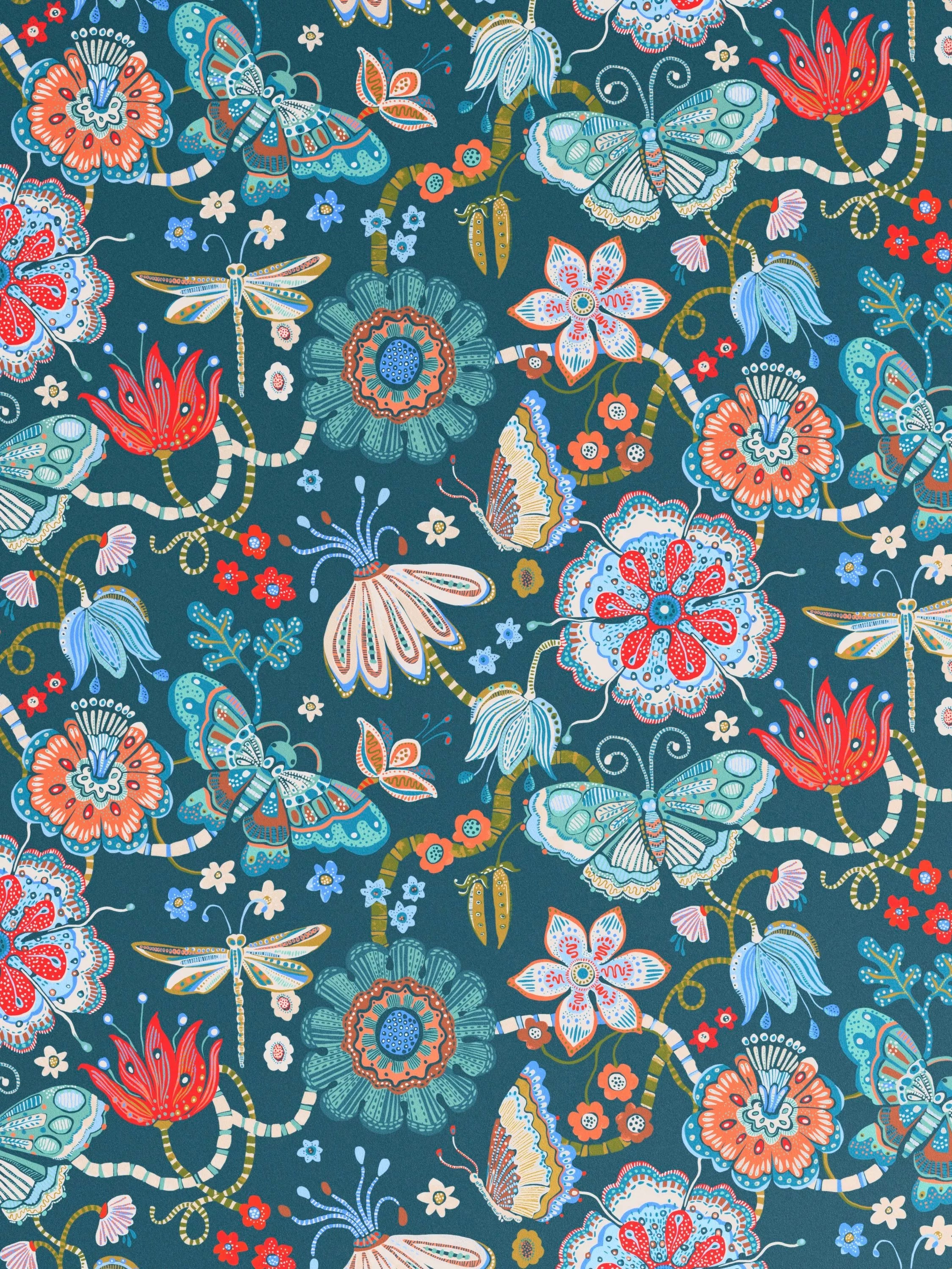 Fantastical plants and butterflies cover this beautiful wallpaper.