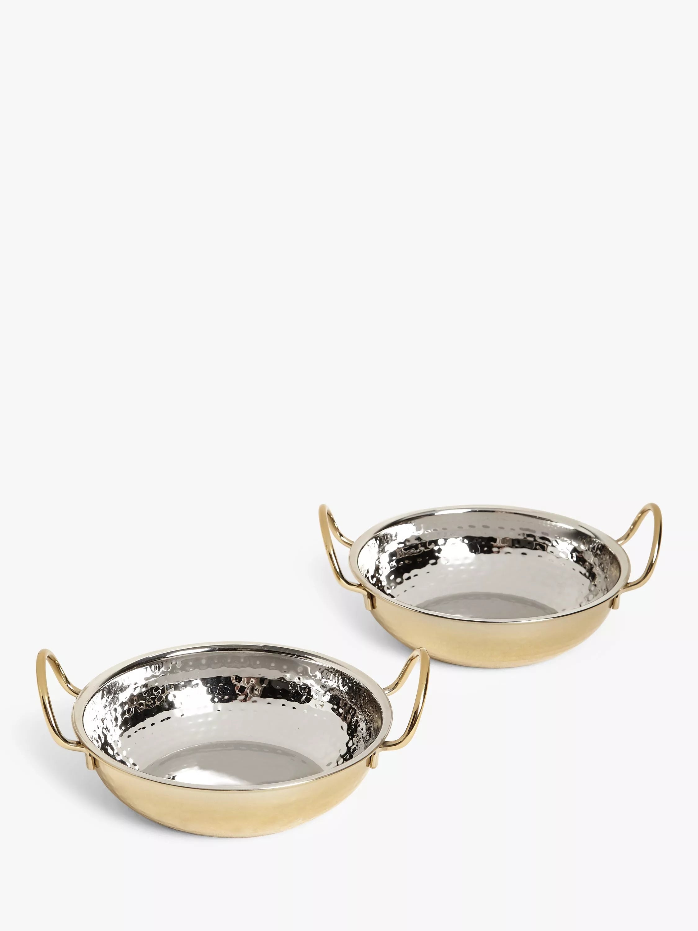Elevate your dining experience with this stunning pair of hammered stainless steel balti serving dishes. Their elegant gold finish and generous size make them perfect for sharing delicious meals with family and friends. These dishes are a beautiful addition to any table setting.
