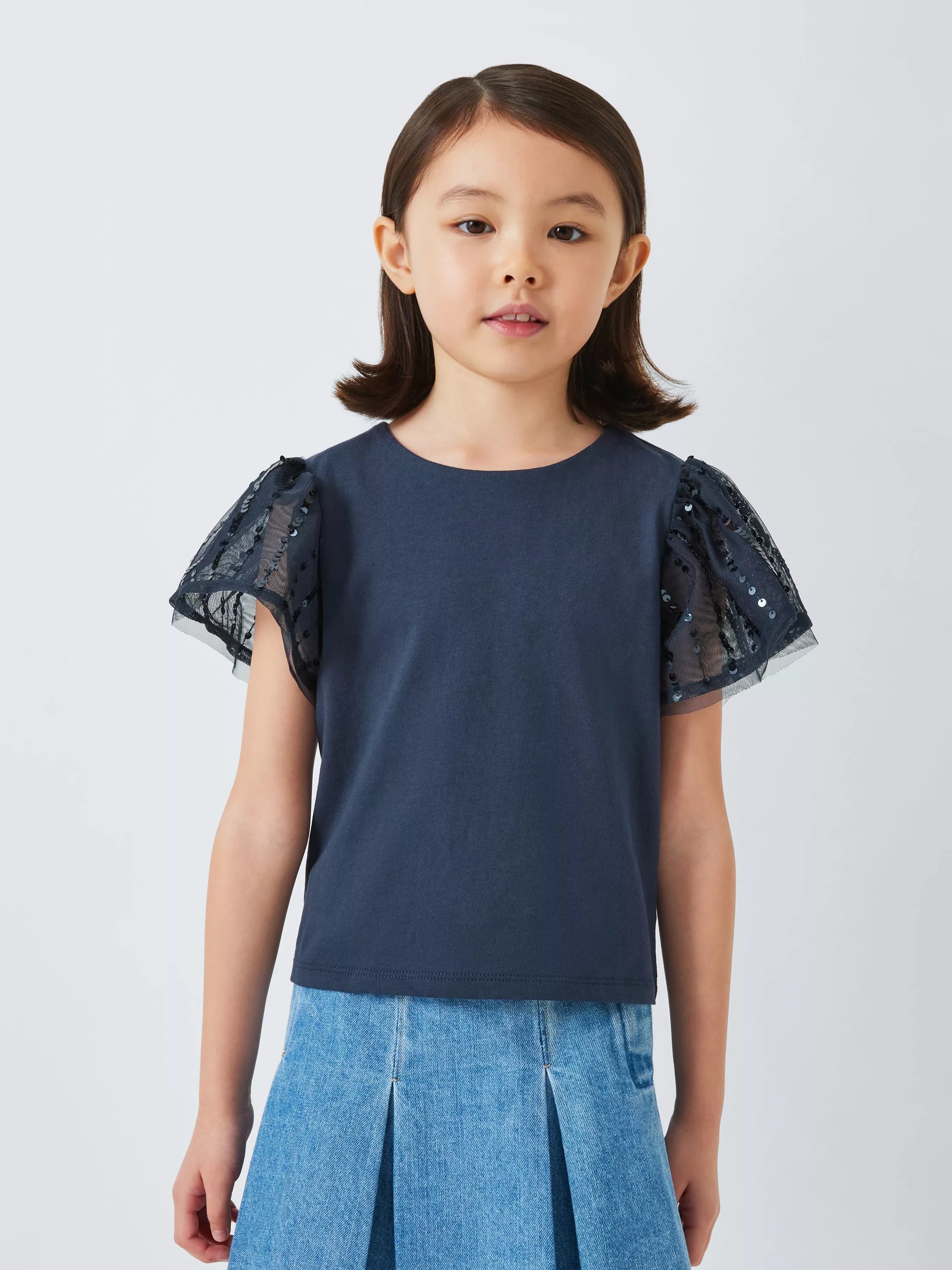 A cotton single jersey t-shirt with mesh sleeves - exactly what their disco night outfit has been waiting for! With sequins on the sleeves, it has a simple button opening to centre back neck.