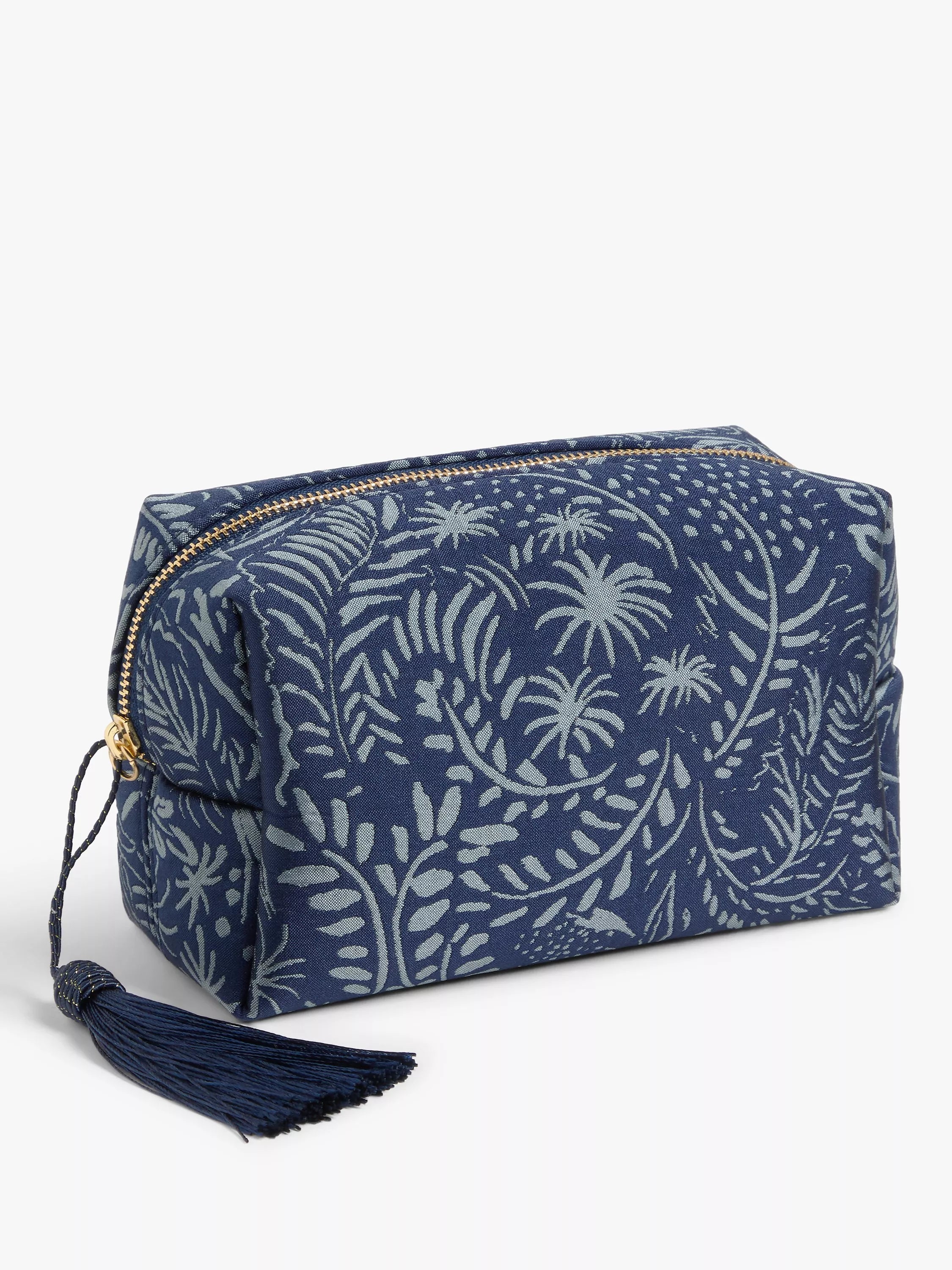 Adorned with a beautifully intricate swirling leaf pattern, this make up bag is accented with an elegant, tassel zip pull.