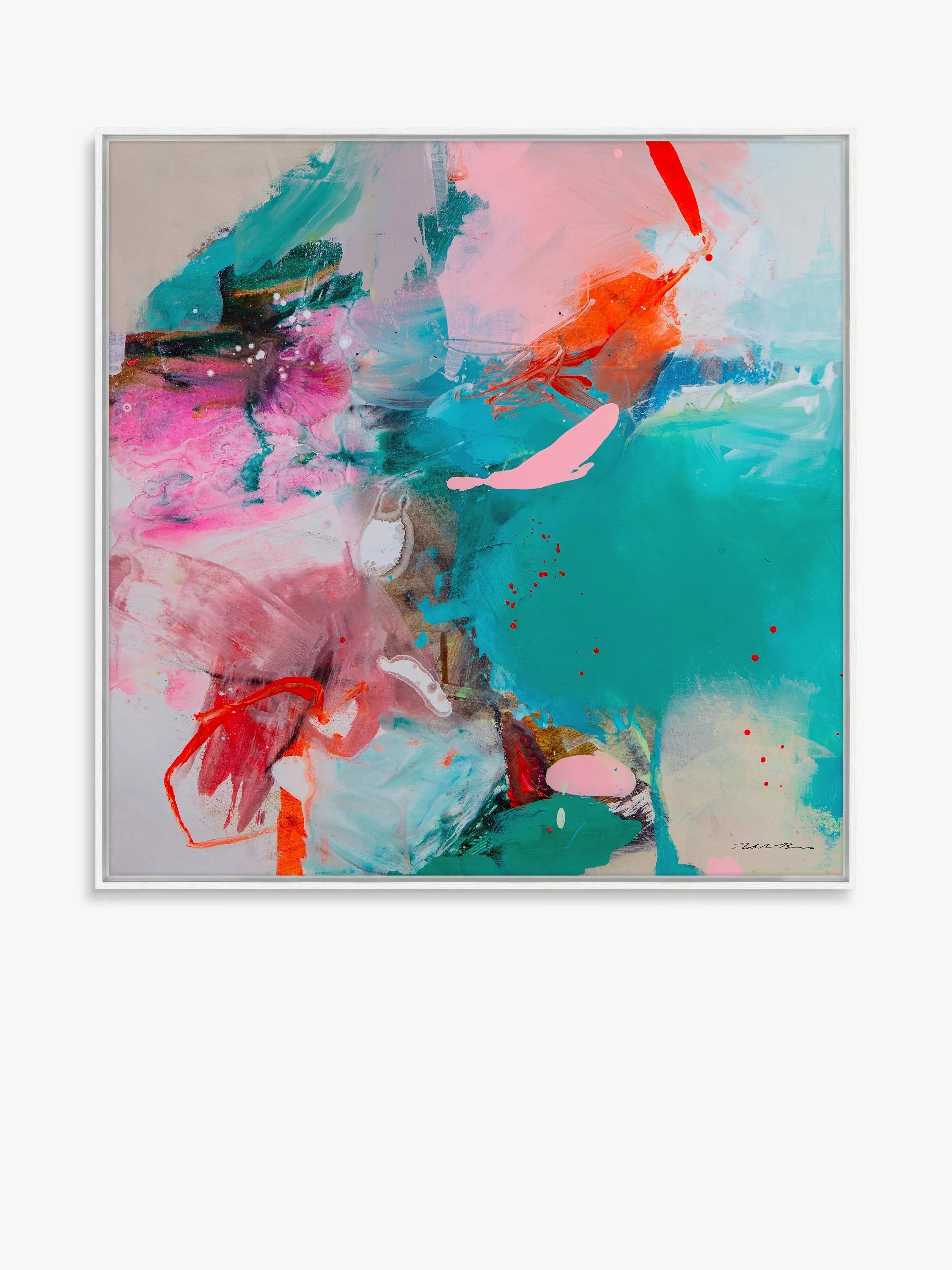 An abstract print, 'Wash Over Me' by artist Natasha Barnes. Made in the UK, this colourful canvas wrap print is mounted in a white frame, a deep frame that creates an elegant shadow gap around the picture. Arrives ready to hang on your wall.