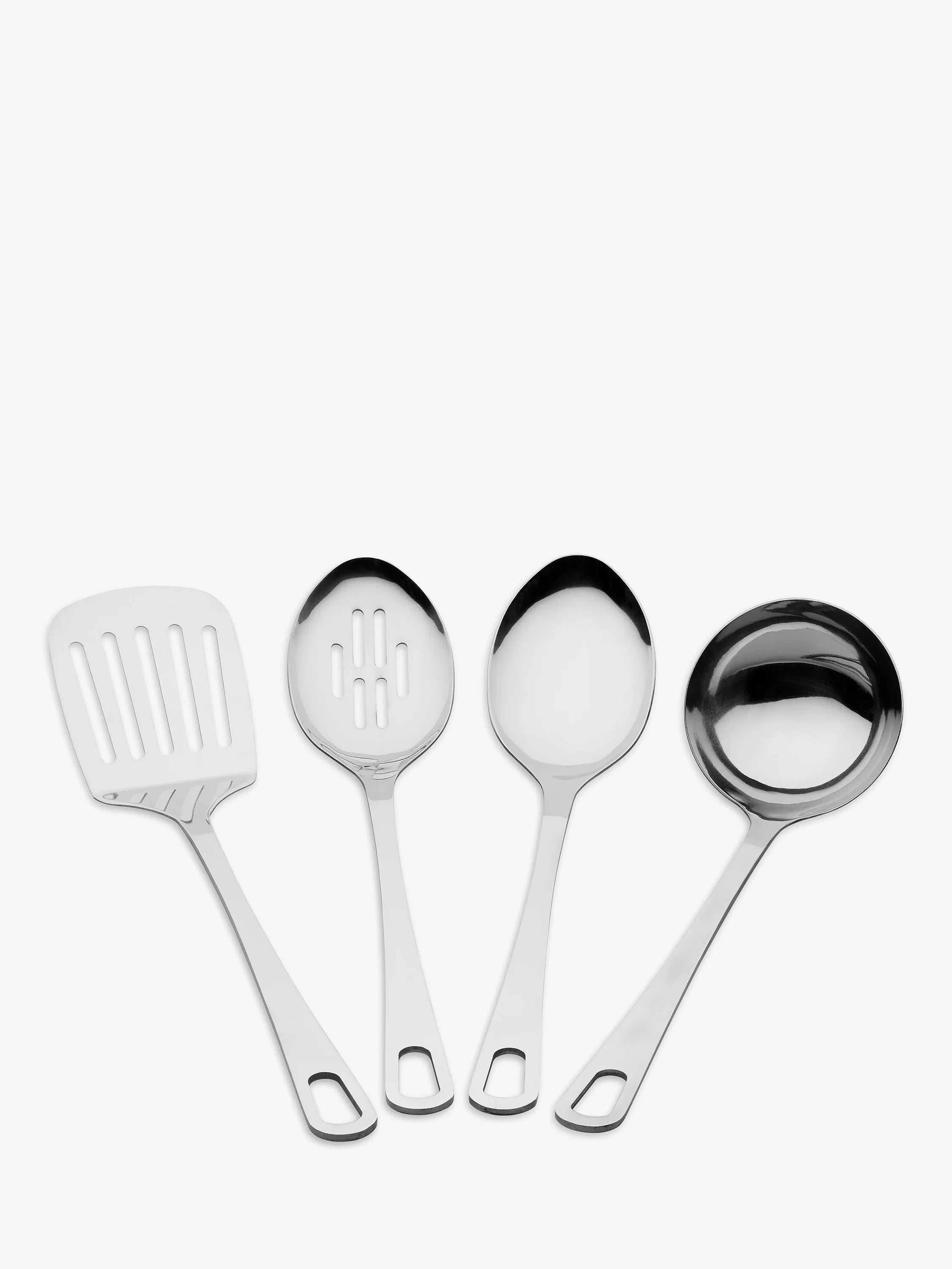 Four essential kitchen utensils, made of stainless steel. Each one has a hanging hole on the handle. Dishwasher-safe for easy cleaning.