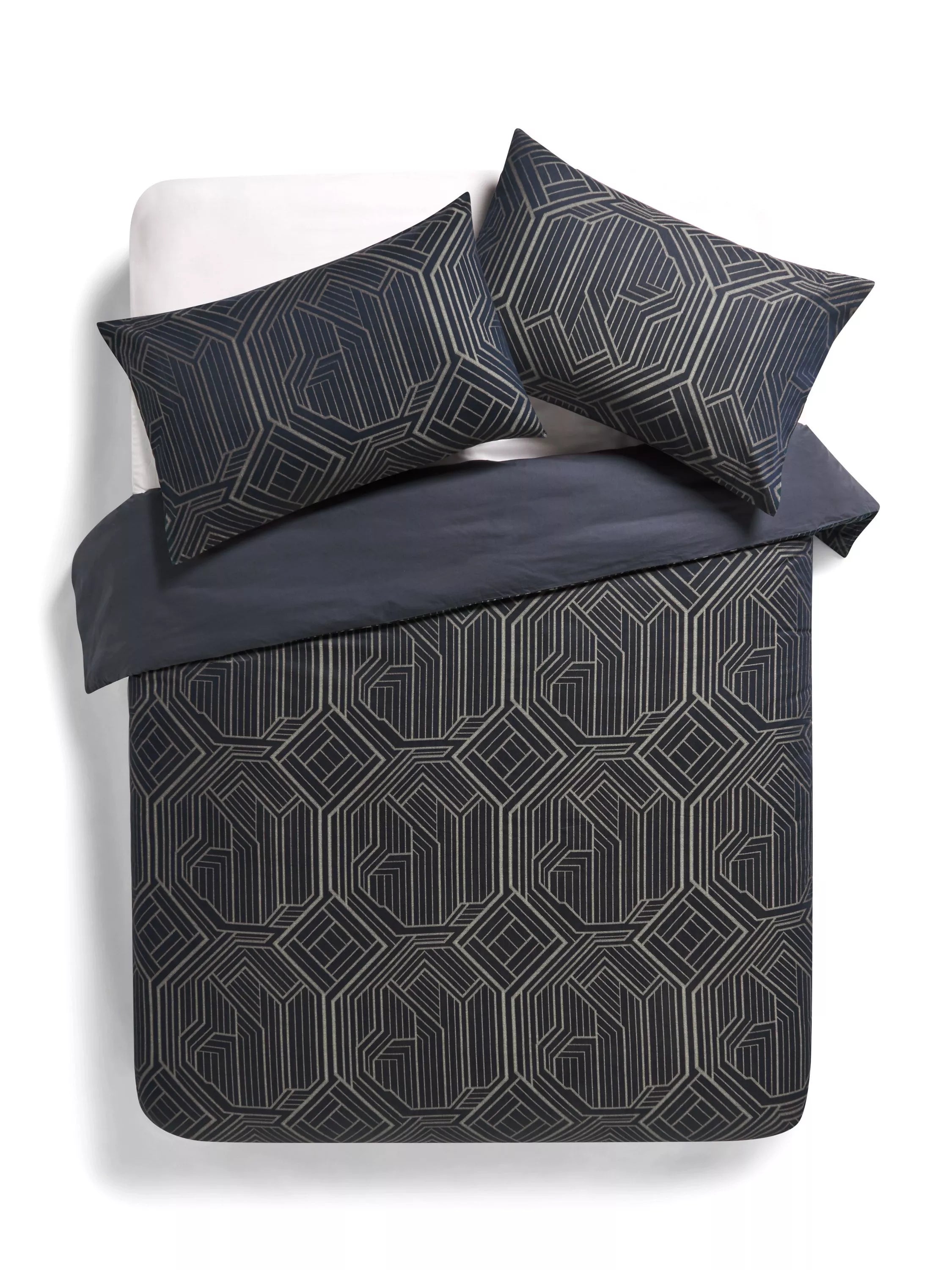 Dramatic, Art Deco style Jacquard bedding with gold highlights.