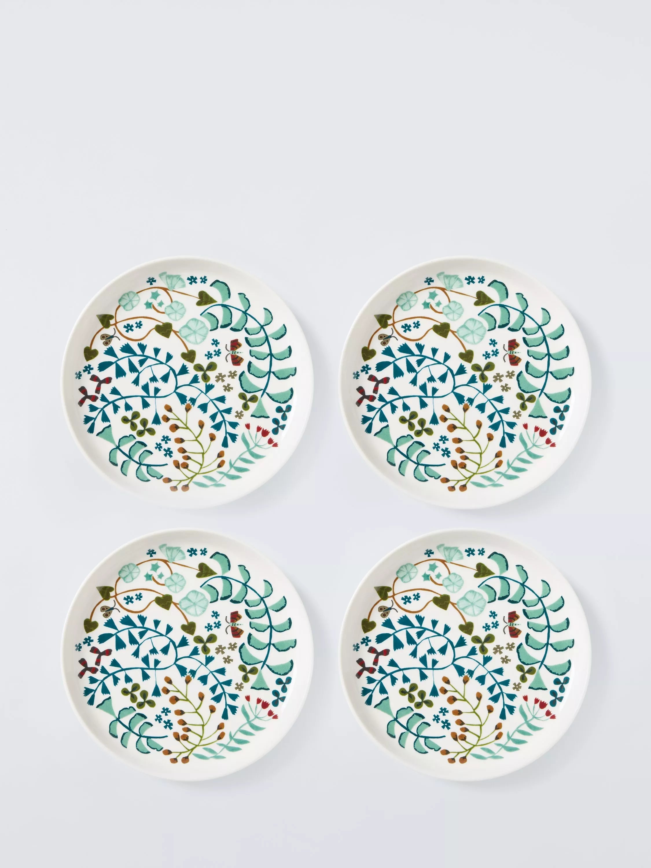 Our fine china Ulla tableware features a nature-inspired floral print created by our Design Studio. Finished with gold foil accents, these four cake plates are packaged in a gift box.