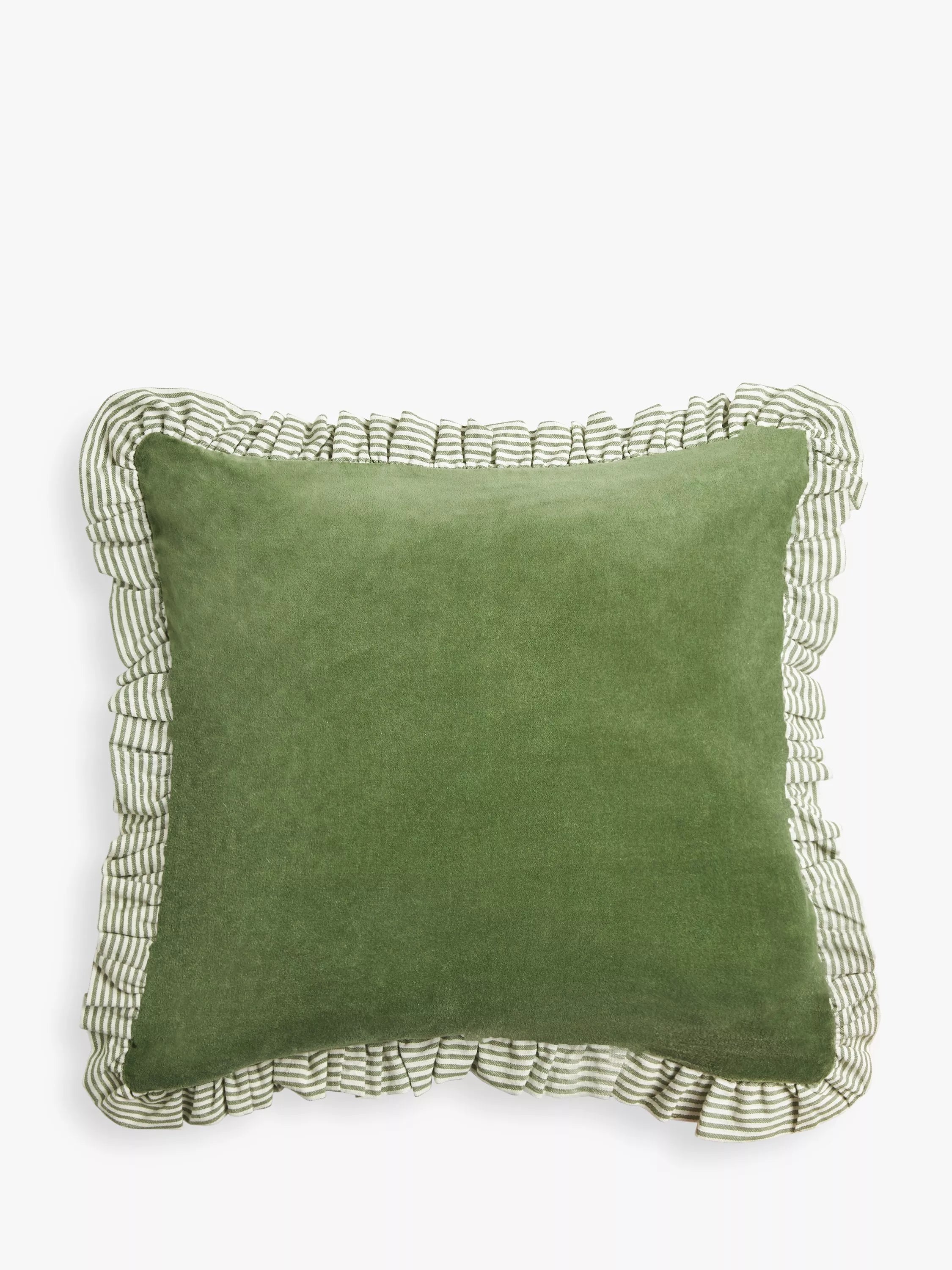 This velvet frill cushion will look just at home on a sofa, armchair or bed. Pretty and versatile, it reverses to a cotton stripe for an alternative look.