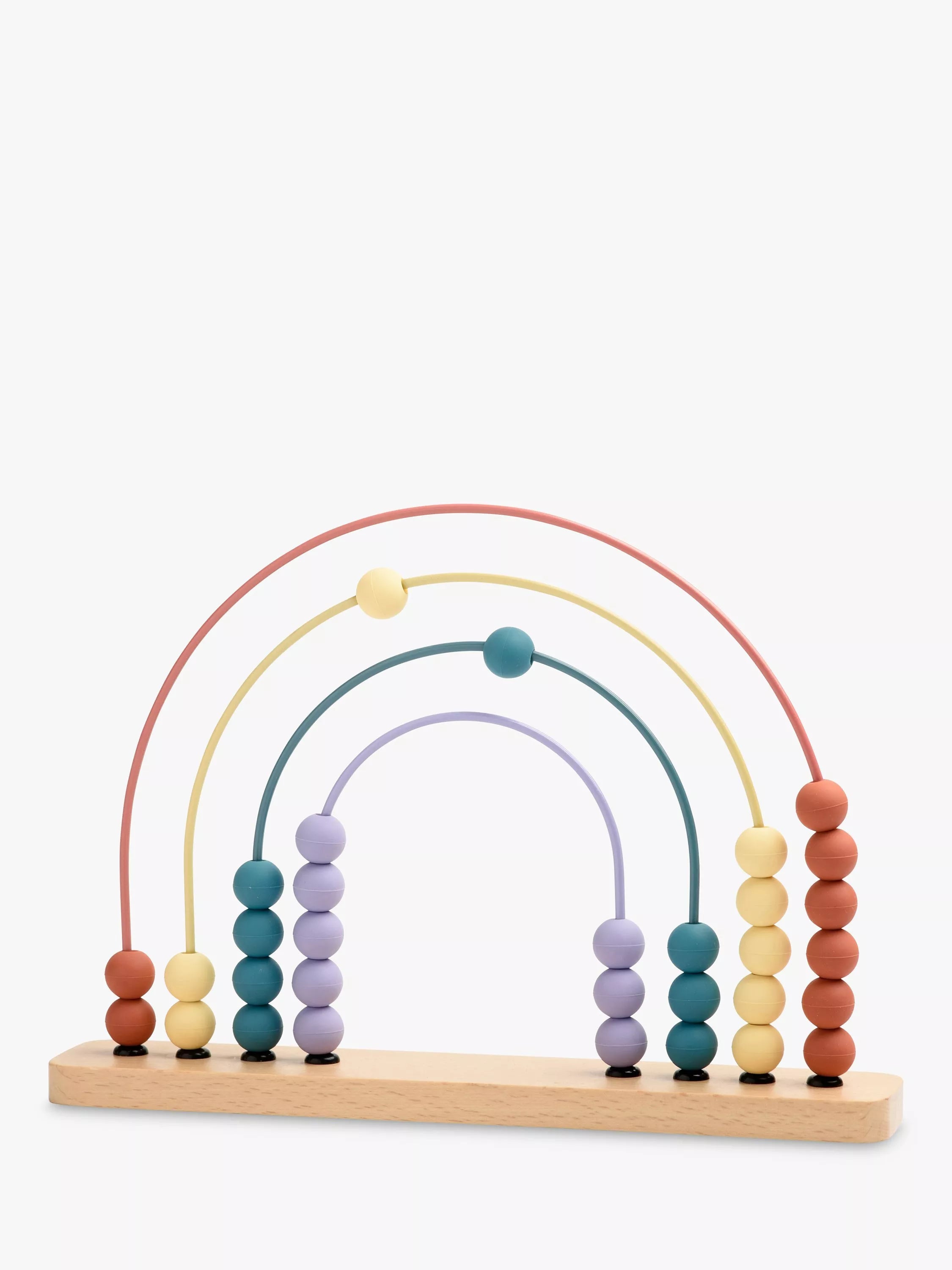 Doubling up as a charming nursery decoration, our rainbow abacus features a wooden base and softly-toned silicone beads to match the colourful wireframes. Abacus toys are excellent for teaching kids early maths and counting skills, while the silicone beads give them a new texture to explore.