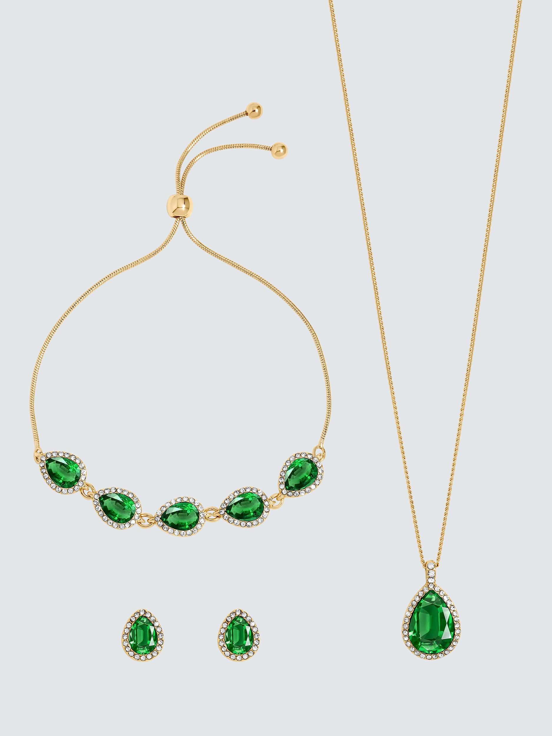 Jon Richard offers this Gold Plated Emerald Pear Drop Trio Set designed for achieving bold elegance. This stunning jewellery set features rich emerald stones set against a luxurious gold plating finish. It is the perfect accent for any look.