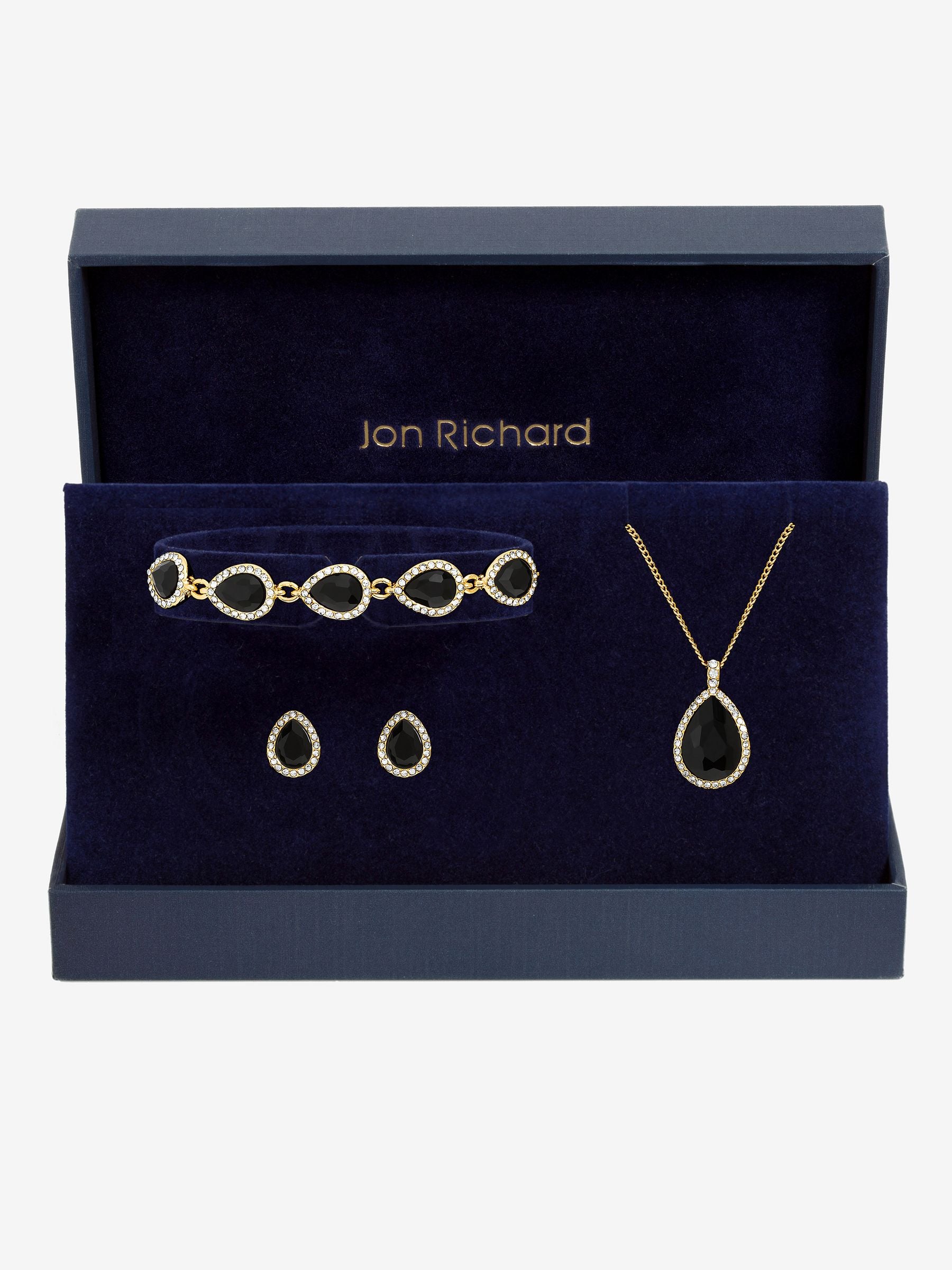Our Gold Plated and Jet Pear Drop Trio Set is designed to add bold elegance to any occasion. Featuring sleek jet stones set against a rich gold plated finish, this stunning set is the perfect way to elevate your jewellery collection with statement style. Fastening: Lobster Clasp, Post and Bullet Back. Width dimension: 13mm, 9mm, 9mm. Length dimension: 13mm, 9mm, 9mm. Material: Gold Plated Base Metal.