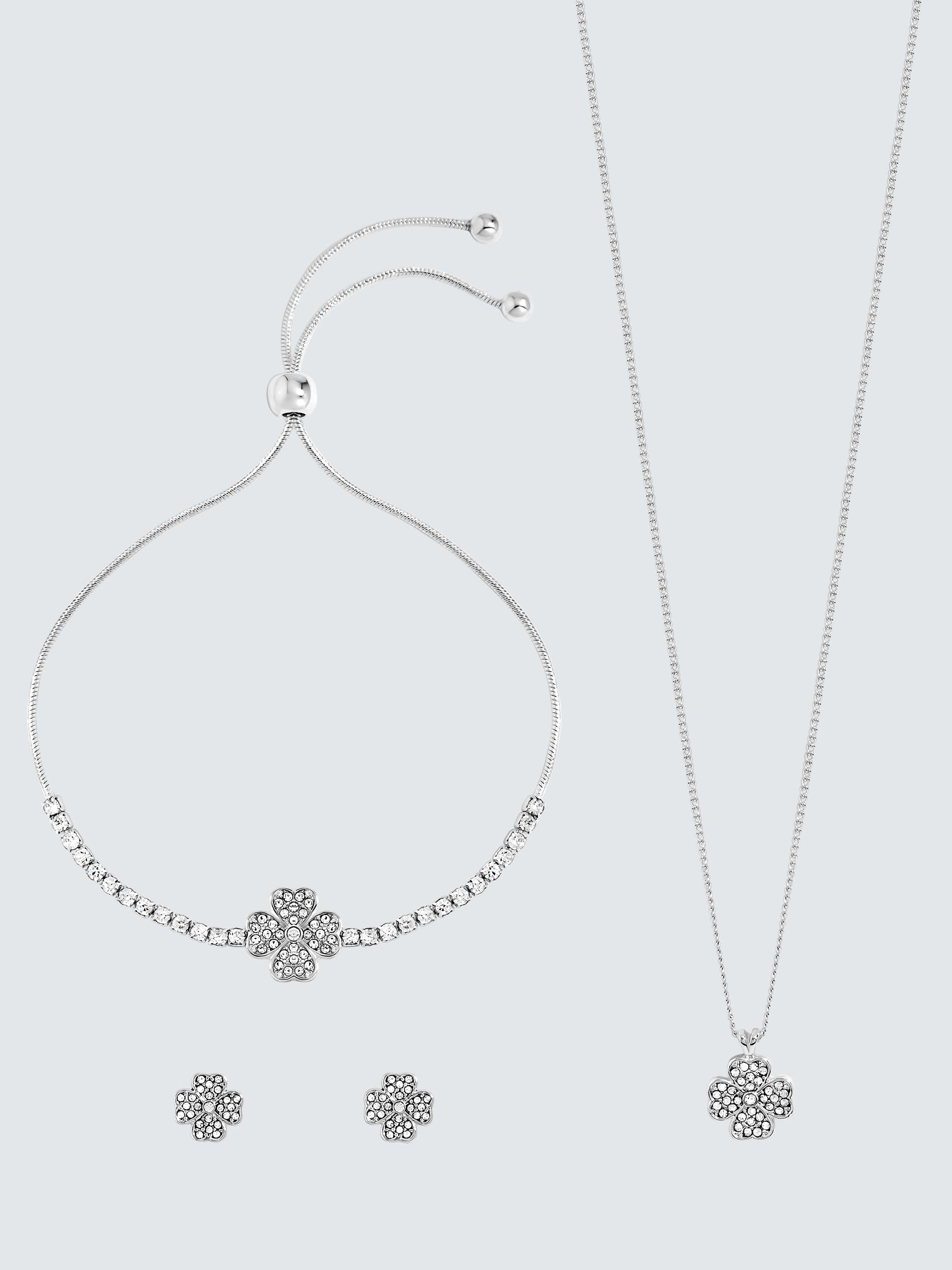 The Silver Plated and Pave Clover Trio Set is designed to bring luck to your everyday style. Featuring a delicate four leaf clover design, each piece is adorned with sparkling pave crystals and finished in radiant silver plating. This elegant set brings a touch of charm and shine to any jewellery collection. The earrings are suitable for pierced ears only.