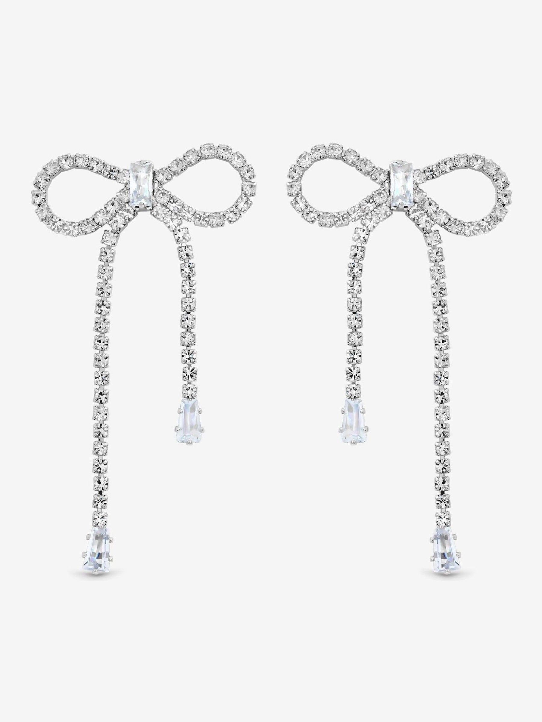 Our Silver Plated Crystal Statement Bow Drop Earrings are delicately designed, featuring a standout bow design with sparkling crystals, finished in radiant silver plating. These timeless drops add a touch of bold elegance to any jewellery collection. Fastening: Post and Bullet Back. Width dimension: 26mm. Length dimension: 45mm. Material: Silver-plated Base Metal.