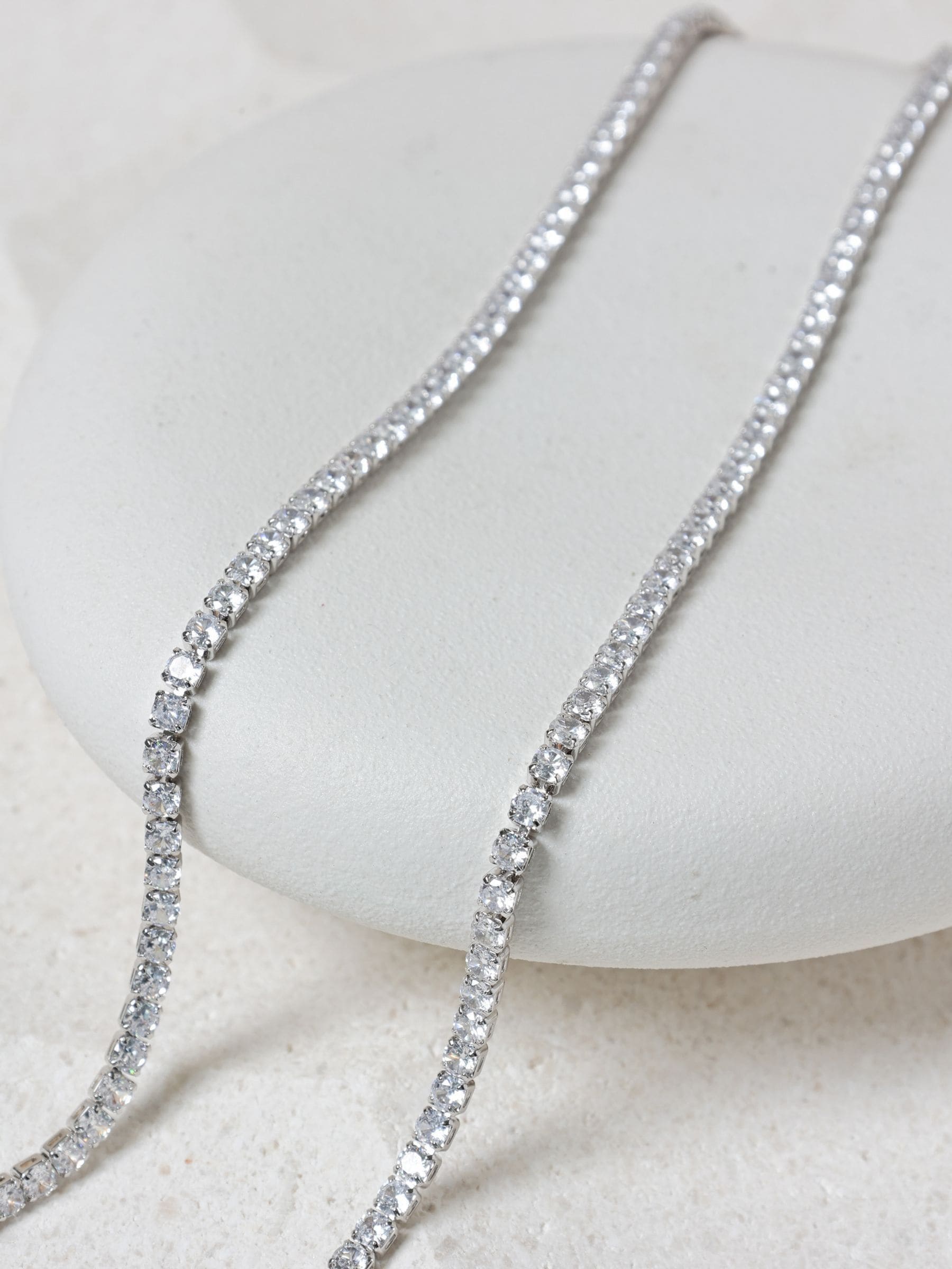 Our Rhodium Plated and Cubic Zirconia Round Tennis Bracelet is designed to bring effortless elegance to any occasion. Featuring shimmering CZ crystals that catch the light from every angle and finished in rich Rhodium plating, this graceful tennis design adds a touch of timeless sparkle. It is the perfect piece to elevate your jewellery collection. Fastening: Lobster Clasp. Width dimension: 4mm. Length dimension: 190.5mm. Material: Rhodium Plated Base Metal.