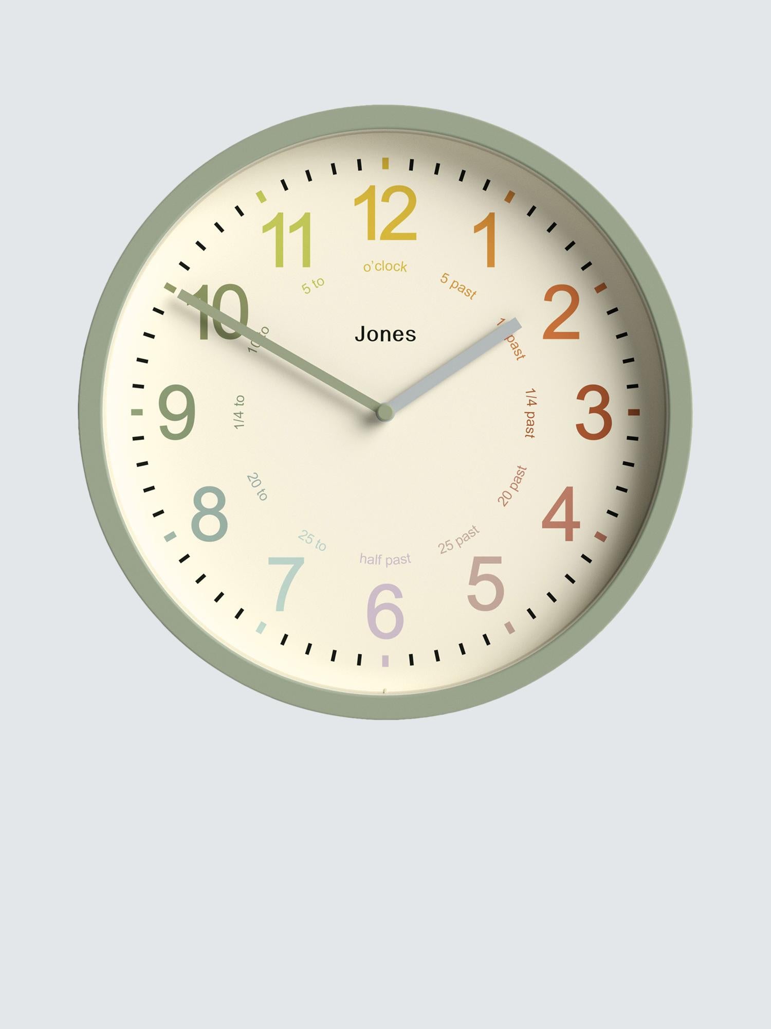 Jones Clocks Analogue Wall Clock 25Cm assists children learning time reading skills easily and clearly. This round timepiece showcases a durable acrylic casing and vibrant, multi-coloured Arabic numerals under a protective glass lens. It enhances any nursery, playroom, or classroom environment effectively. A stylish essential piece for daily routine use.