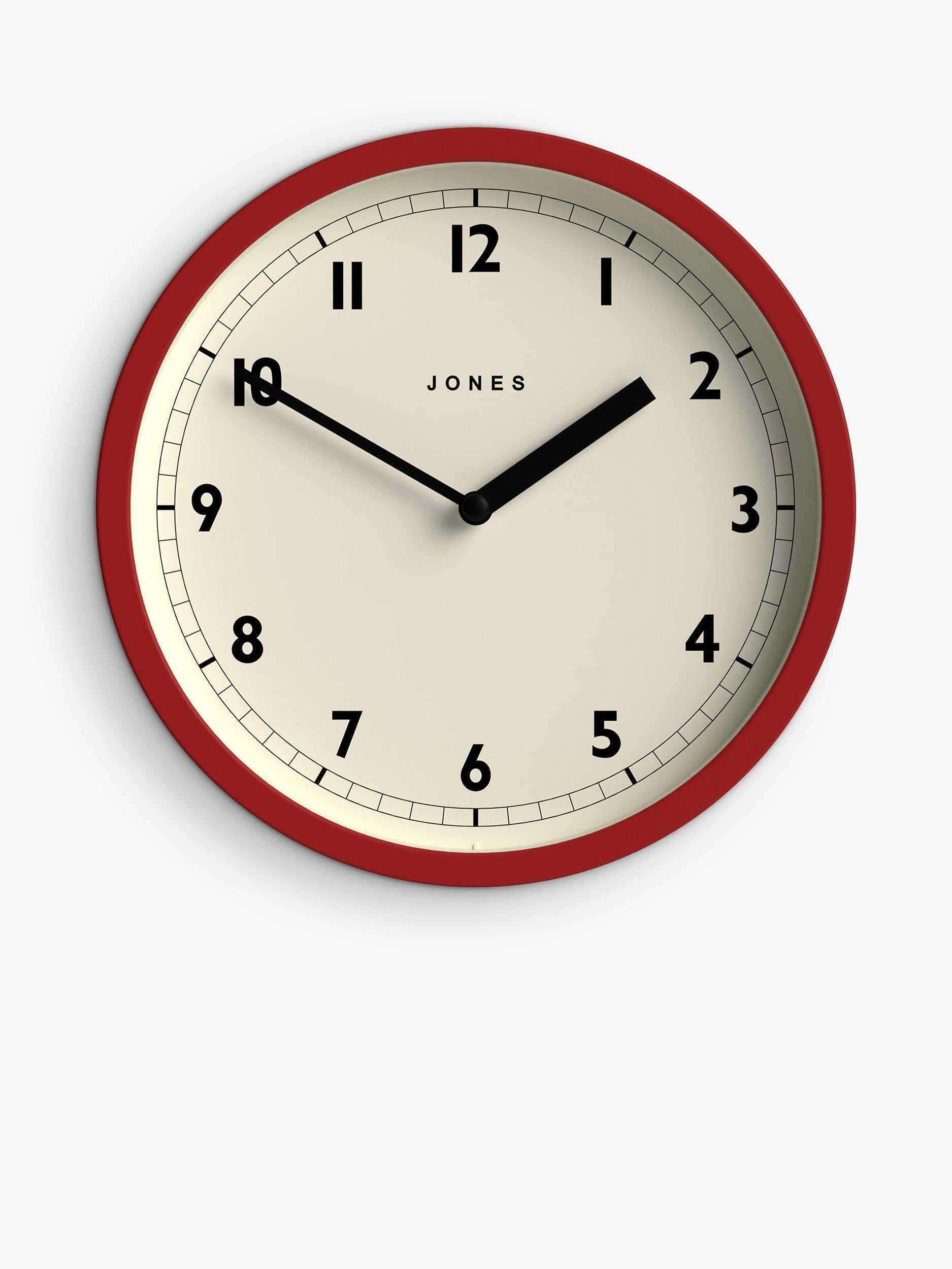 4.7/5 A contemporary and minimalist design, the Jones Clocks Twist round analogue wall clock has an acrylic case, linear metal clock hands, a glass lens and easy-to-read Arabic numerals marking the hours. A focal point for the kitchen, bedroom, living room or office.