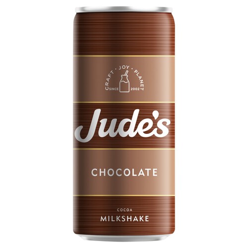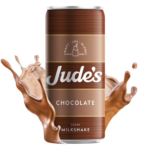 Jude's Chocolate Milkshake offers a convenient, ready-to-drink beverage presented in a sleek, modern can format. This product clearly communicates a commitment to quality, enjoyment, and environmental consideration through its distinctive packaging details. Enjoy the rich cocoa flavour whenever you need a satisfying refreshment on the go.