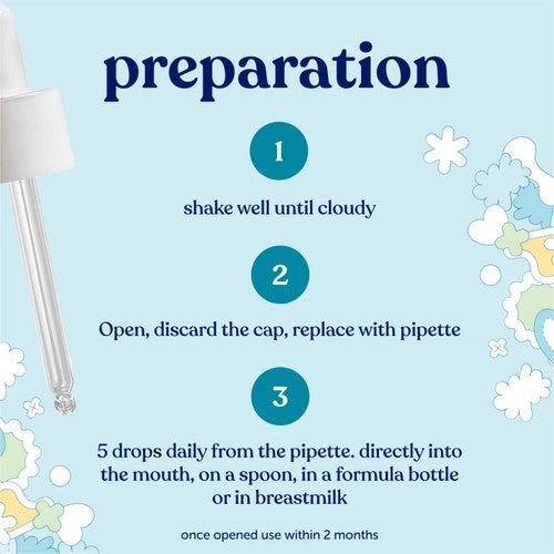 3. Administer 5 individual droplets daily from the pipette either directly into the mouth, on a spoon, in a formula bottle or in breastmilk.