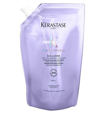 Kérastase Blond Absolu Bain Lumiere is a nourishing cleanser specifically designed for lightened, highlighted, or grey hair. This lightweight formula gently cleanses while delivering essential hydration from the roots to the ends of your hair. It works to illuminate blonde tones and actively removes dulling agents and environmental pollution. Enriched with Hyaluronic Acid and Edelweiss flower, this product helps protect the hair fibre from damage. This is a convenient 500ml refill pouch format for replenishment.