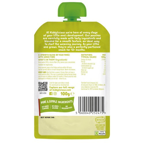 This Kiddylious pouch offers a smooth pear puree specifically formulated for babies aged six months and older. It provides a convenient way to offer fruit while supporting digestive wellness through its fibre content. The product utilizes pure and simple ingredients, ensuring quality in every serving.