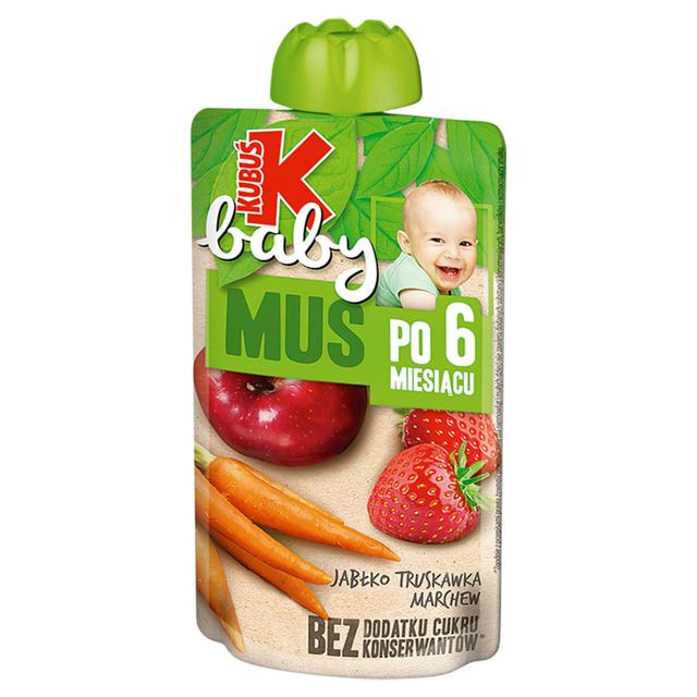This Kubus purée offers a delicious blend of apple, strawberry, and carrot in a smooth baby food mousse texture. It is a thick, pasteurised preparation suitable for infants aged over six months. The ingredients consist primarily of fruit purées, making it a simple option for little ones.