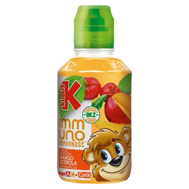 This Kubus Immuno drink features a blend of apple, carrot, mango, orange, and acerola fruit juices. It is a thick, pasteurised preparation noted for its rich nutritional profile. This convenient 200ml portion provides essential vitamins and minerals derived from its fruit and vegetable content.